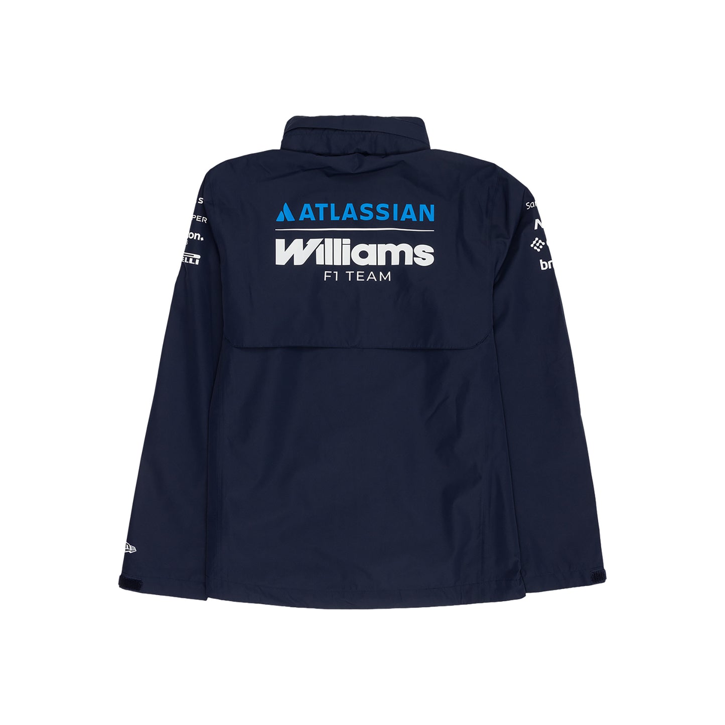 The Atlassian Williams F1 Team Team Line Rain Jacket features a screen-printed team wordmark at the left mid chest with New Era Flag at the upper right front chest, a fold away adjustable hood, adjustable hem, and back vent for extra breathability. Additional details include sponsor branding at the front chest and sleeves with an enlarged Atlassian Williams F1 Team wordmark at the rear. The jacket offers protection against rain with 2L polyester fabric that has a waterproof rating 10K MM hydrostatic head and fully seam taped.