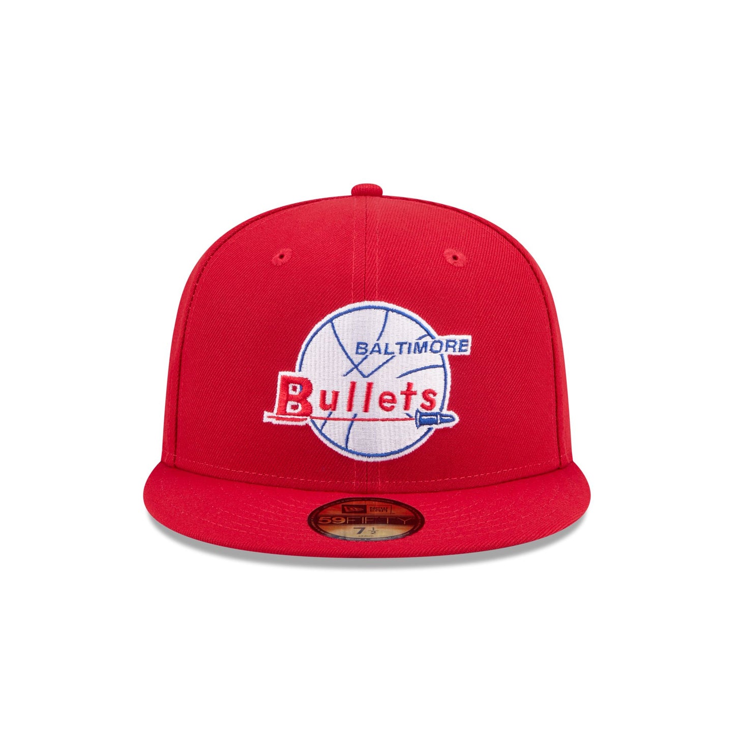 The Baltimore Bullets 1963-1968 Hardwood Classics 59FIFTY Fitted Cap features an embroidered vintage Bullets logo at the front panels with the NBA Logoman at the rear and a gray undervisor.