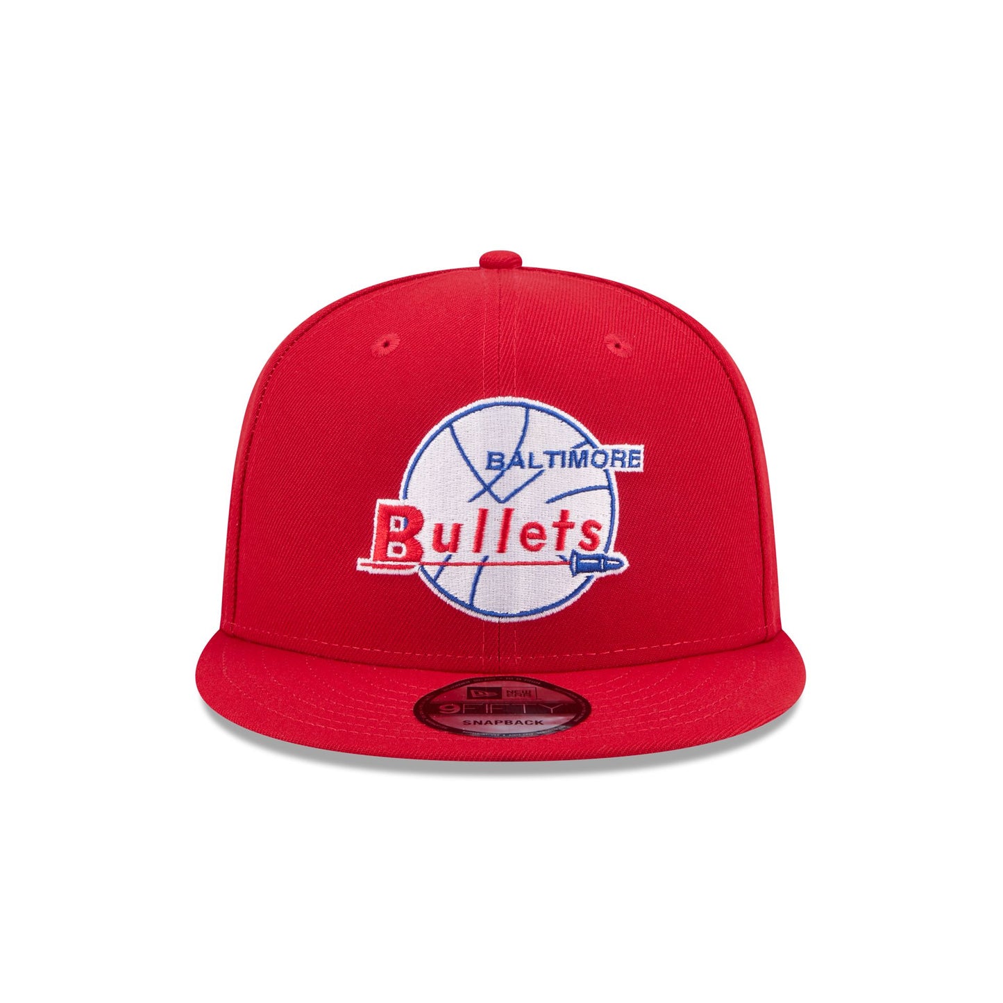 The Baltimore Bullets 1963-1968 Hardwood Classics 9FIFTY Snapback features an embroidered vintage Bullets logo at the front panels with the NBA Logoman at the right-wear side. Additional details include an adjustable snapback closure at the rear and a gray undervisor.