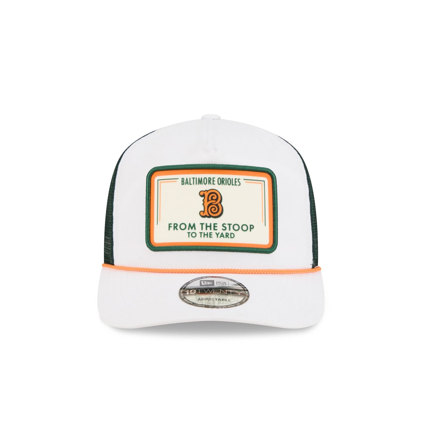 The Baltimore Orioles 2026 City Connect Fan Pack Pre-Curved 19TWENTY Trucker features a woven Orioles logo and From the Stoop to the Yard wordmark patch at the front panel, inspired by Baltimore Yard and elements from the stadium's scoreboard. Additional details include a brick patterned interior sweatband and undervisor with an adjustable snapback closure at the rear; the brick pattern and colorway are inspired by the architecture and history around Camden Yards.