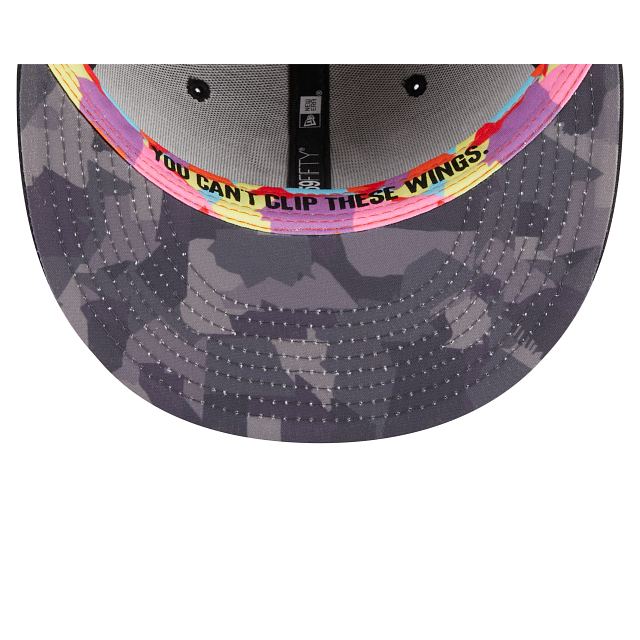 Jersey inspired, city connected. The Baltimore Orioles City Connect 59FIFTY Fitted Cap draws originality from unique elements tied to the surrounding city and features an embroidered Orioles logo at the front panels with a matching MLB Batterman logo at the rear. Additional details include a printed sweatband reading "YOU CAN'T CLIP THESE WINGS." and a gray camo undervisor.