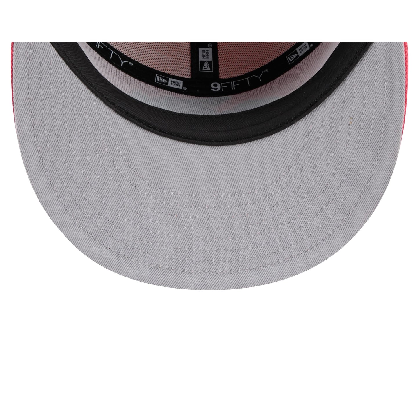 The Baltimore Orioles Coral 9FIFTY Split Panel Snapback features an embroidered Orioles Cooperstown wordmark at the front panels with a snapback closure at the rear, a multicolored crown, and a gray undervisor.
