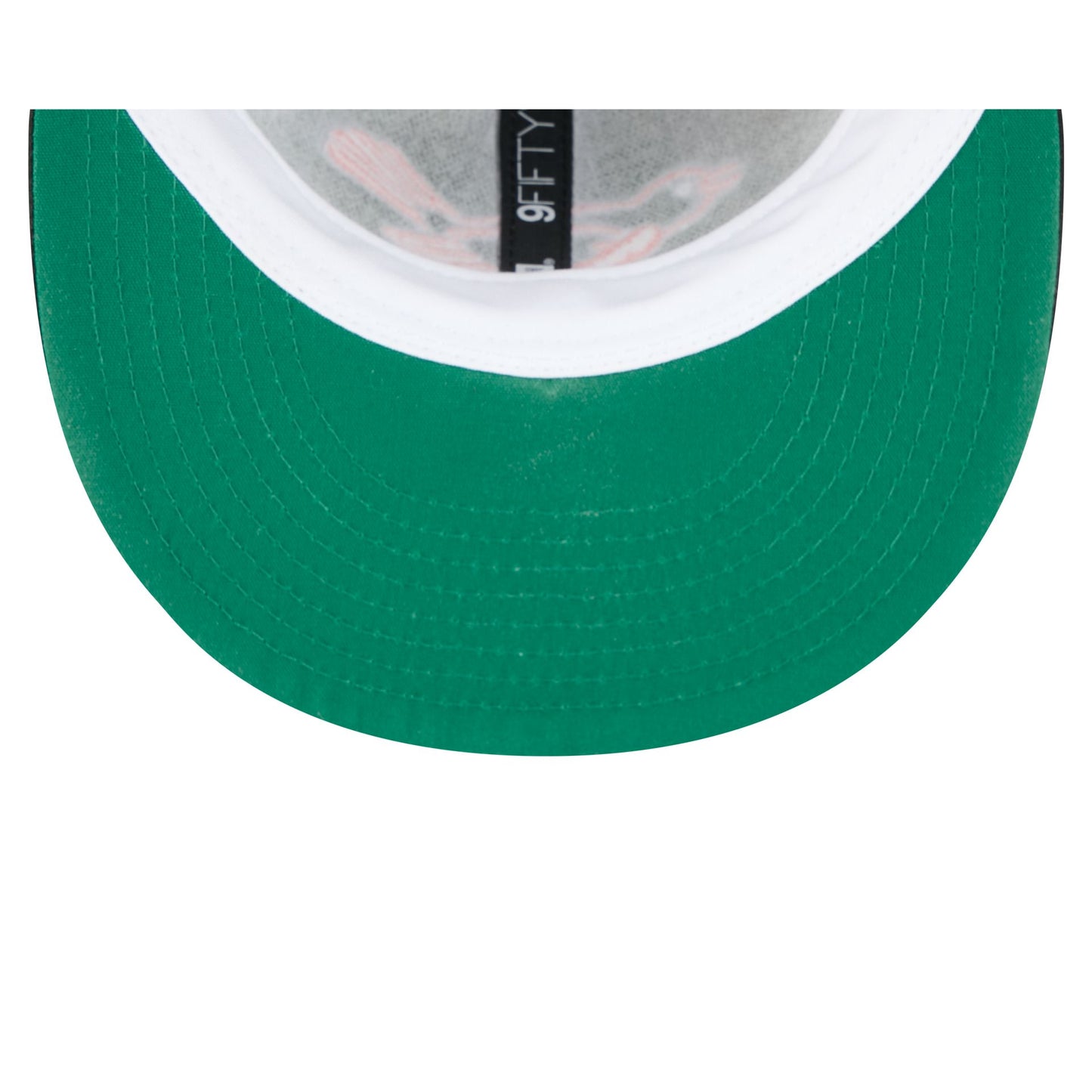 The Baltimore Orioles Hall of Fame 2025 Retro Crown 9FIFTY Snapback features an embroidered Orioles Cooperstown logo at the front panels with a matching MLB Batterman logo above a snapback closure at the rear, a National Baseball Hall of Fame patch at the right-wear side, and a green undervisor.