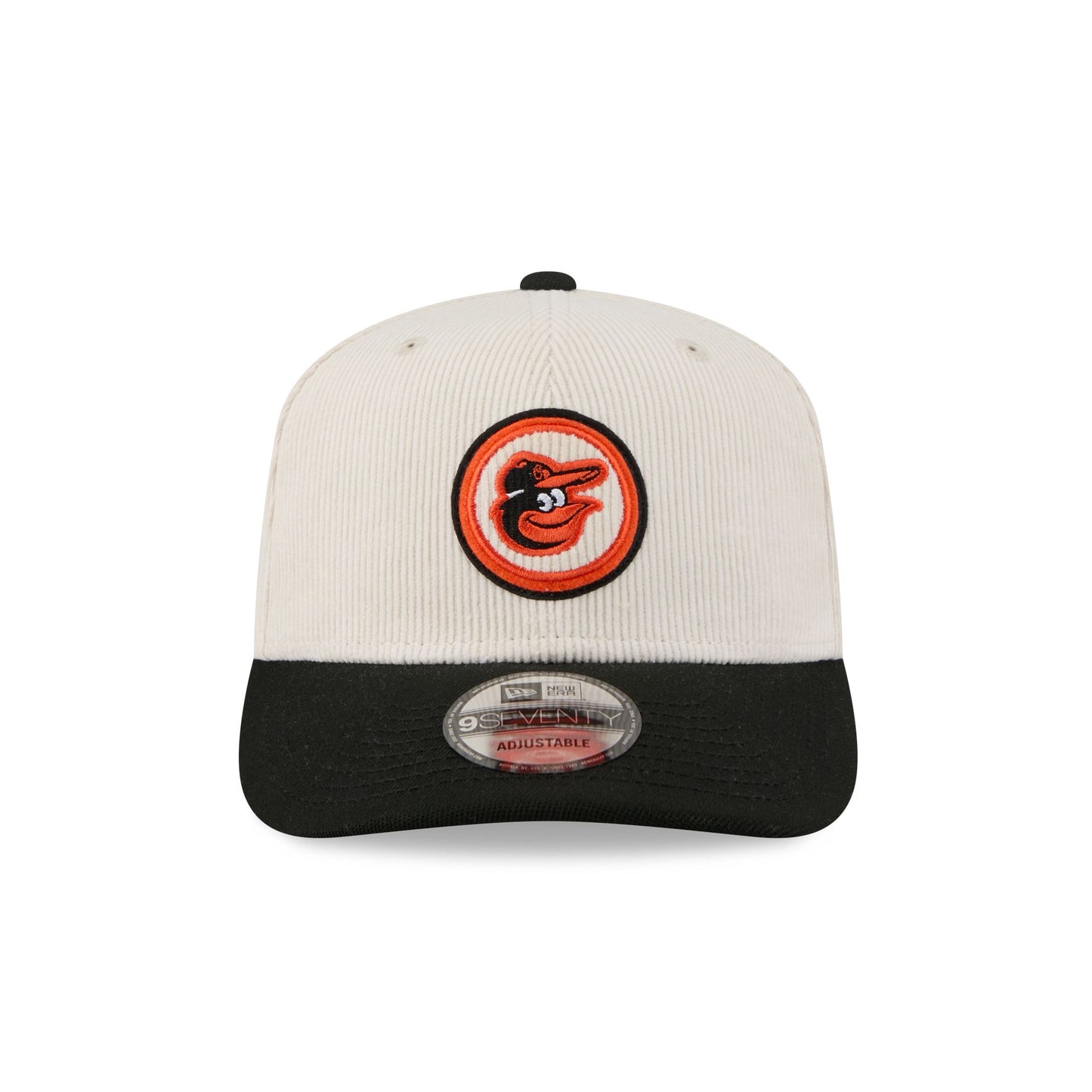 The Baltimore Orioles Loyal Corduroy 9SEVENTY Stretch-Snap features an embroidered Orioles logo at the front panels against a corduroy fabrication throughout the cap with an adjustable stretch-snap closure at the rear.