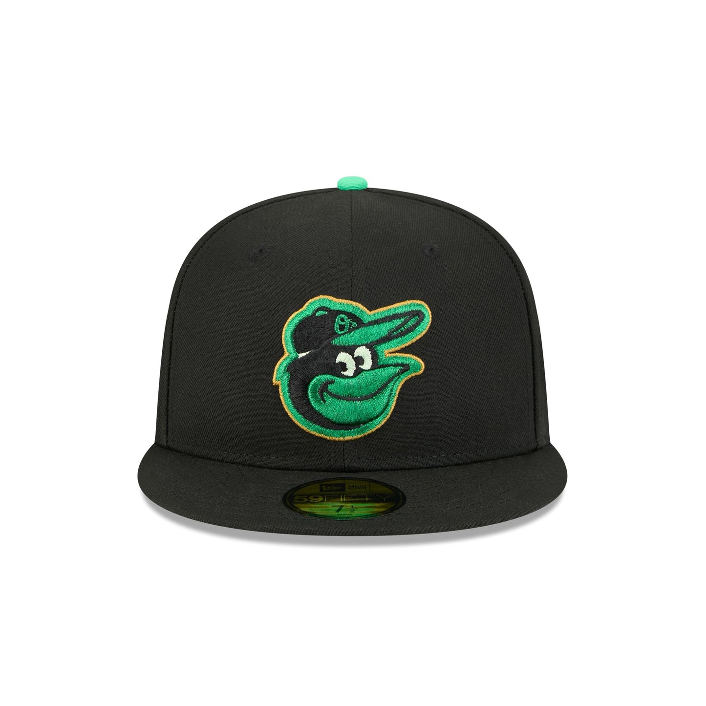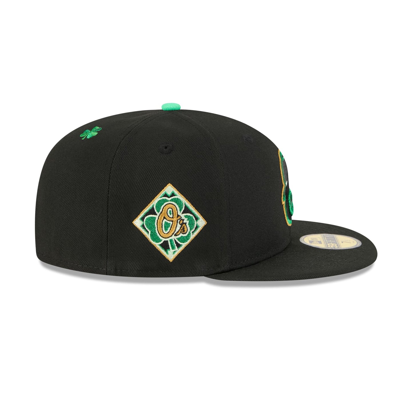 The Baltimore Orioles St. Patrick's Day 2026 59FIFTY Fitted Cap features a green and gold embroidered Orioles logo at the front panels with a matching MLB Batterman logo at the rear and a mini shamrock at the top right. Additional details include a team wordmark over a metallic green shamrock baseball diamond patch at the right-wear side with a green plaid interior fabrication at the front panels.