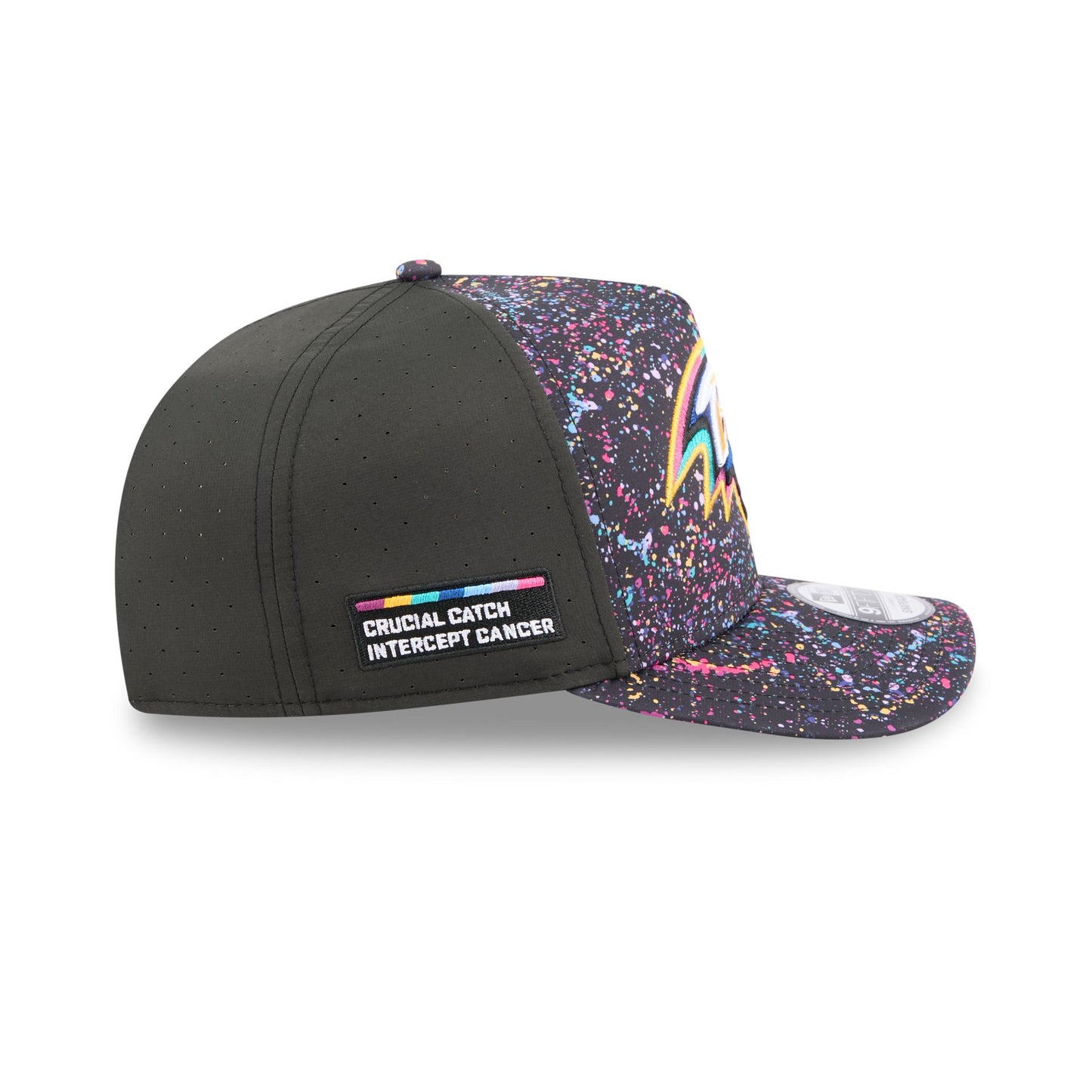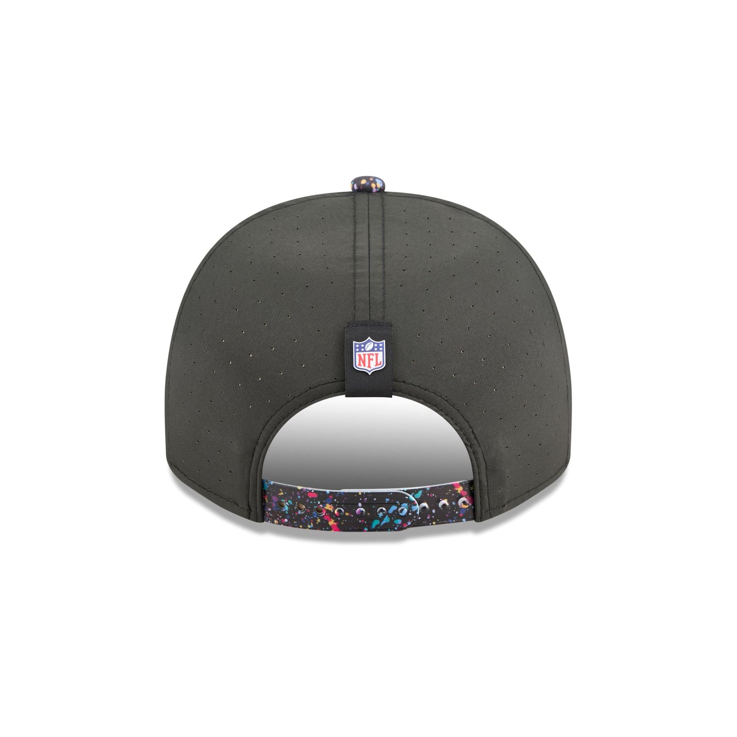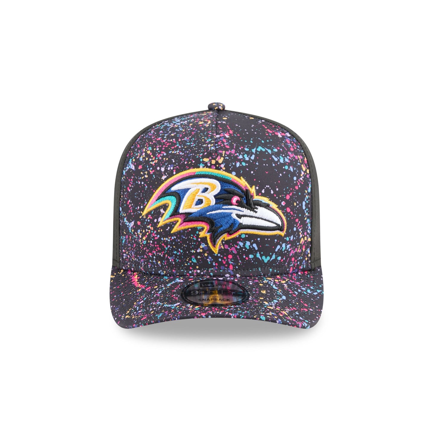 The Baltimore Ravens 2025 Crucial Catch 9FIFTY A-Frame Snapback features an embroidered Ravens logo at the front paint splatter panels with a woven NFL Shield tag above a snapback closure at the rear. Additional details include a Crucial Catch Intercept Cancer patch at the right-wear side and a black undervisor.