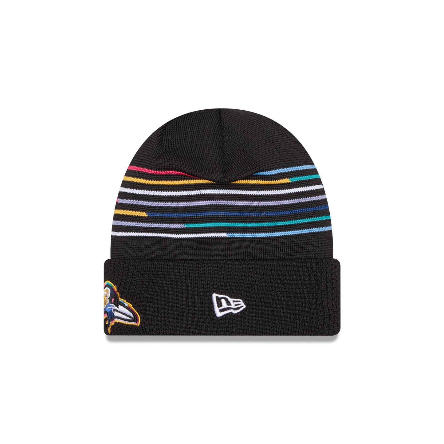 The Baltimore Ravens 2025 Crucial Catch Cuff Knit features an embroidered Ravens logo at the front with matching colored stripes at the crown, an NFL Shield at the rear, and a Crucial Catch Intercept Cancer patch at the right-wear side.