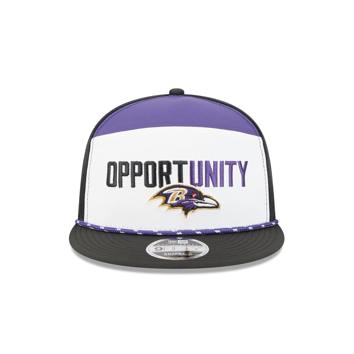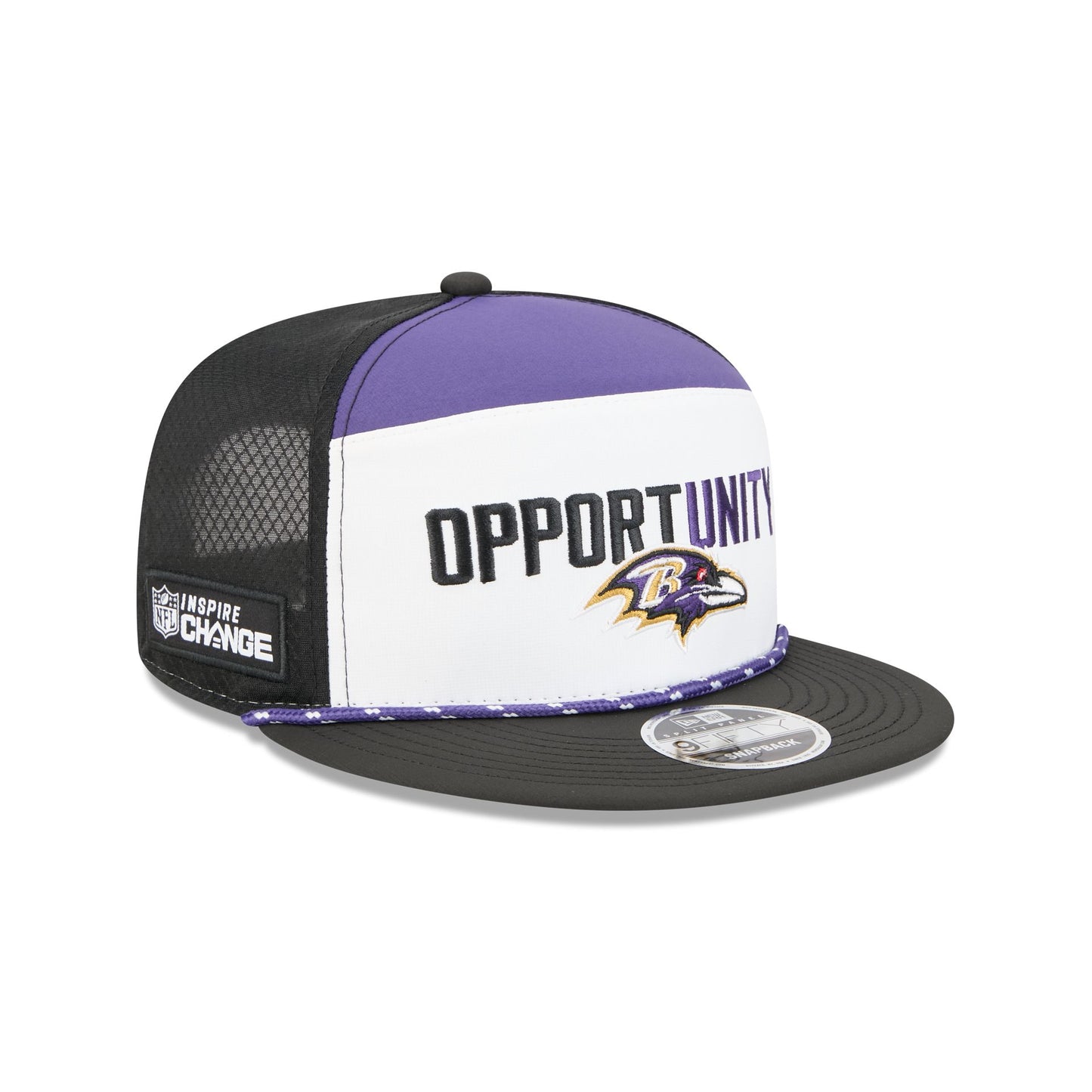 The Baltimore Ravens 2025 Inspire Change Split Panel 9FIFTY Snapback features an embroidered Ravens logo and matching "Opportunity" wordmark at the front panels with an NFL Inspire Change patch at the right-wear side. Additional details include a rope at the visor and an adjustable snapback closure at the rear. The cap has a split crown construction.