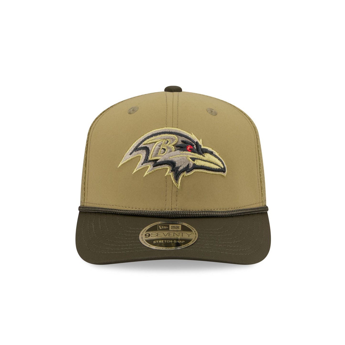The Baltimore Ravens 2025 Salute to Service 9SEVENTY Trucker features an embroidered Ravens logo at the front panels with the official NFL Salute to Service patch above a snapback closure at the rear. Additional details include an American flag patch at the right-wear side with a silicone team logo patch at a dark green undervisor and a digi camo interior fabrication.