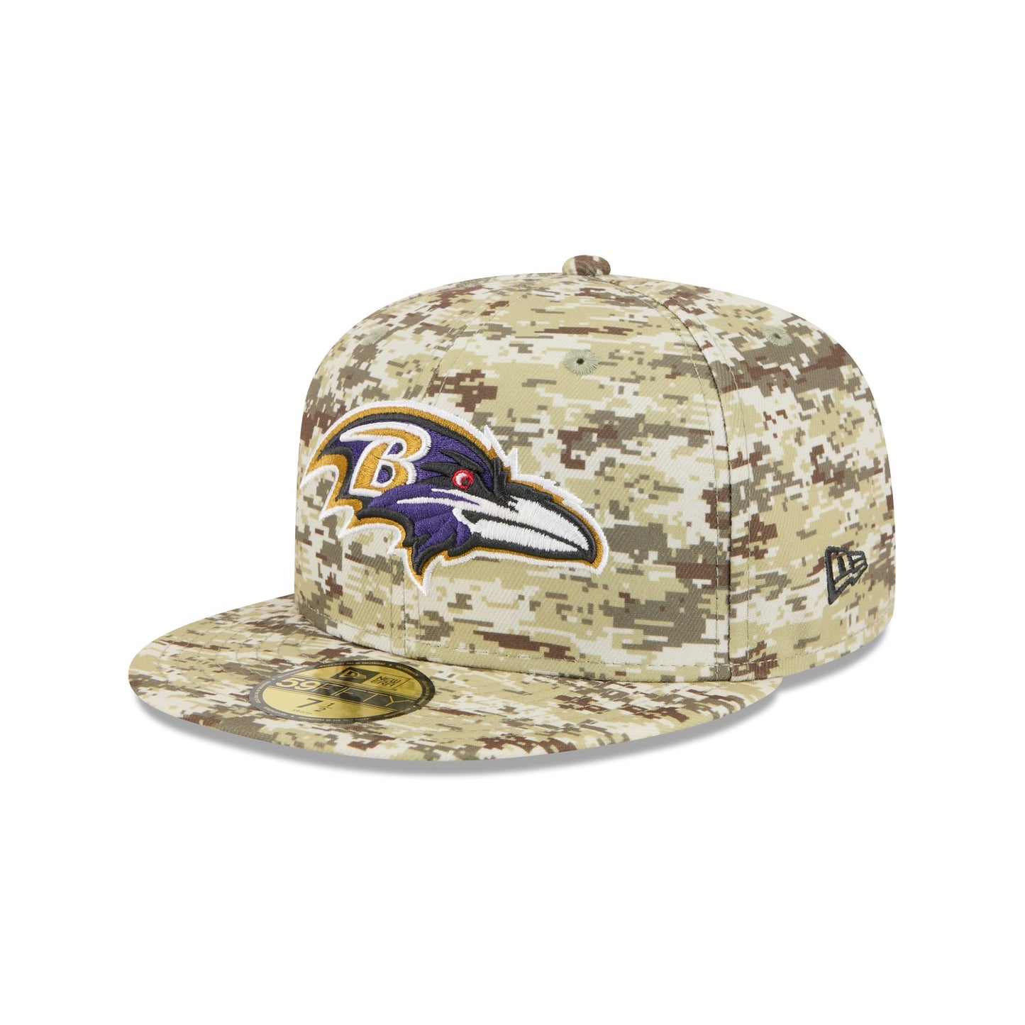 The Baltimore Ravens 2025 Salute to Service Fan Gear 59FIFTY Fitted Cap features an embroidered Ravens logo at the front panels with the official NFL Salute to Service patch at the rear, an American flag patch at the right-wear side, and a gray undervisor.