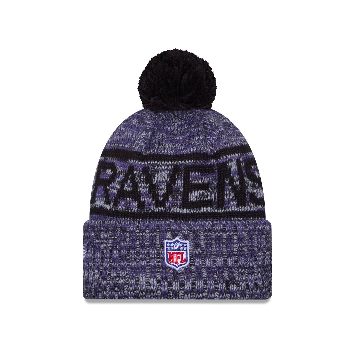 The Baltimore Ravens 2025 Sideline Cold Weather Pom Knit Hat features a sewn-down silicone Ravens logo patch at the front cuff with a matching Official NFL Shield logo at the rear. Additional details include a team wordmark across the crown, a one-time removeable pom, and a fleece lining.