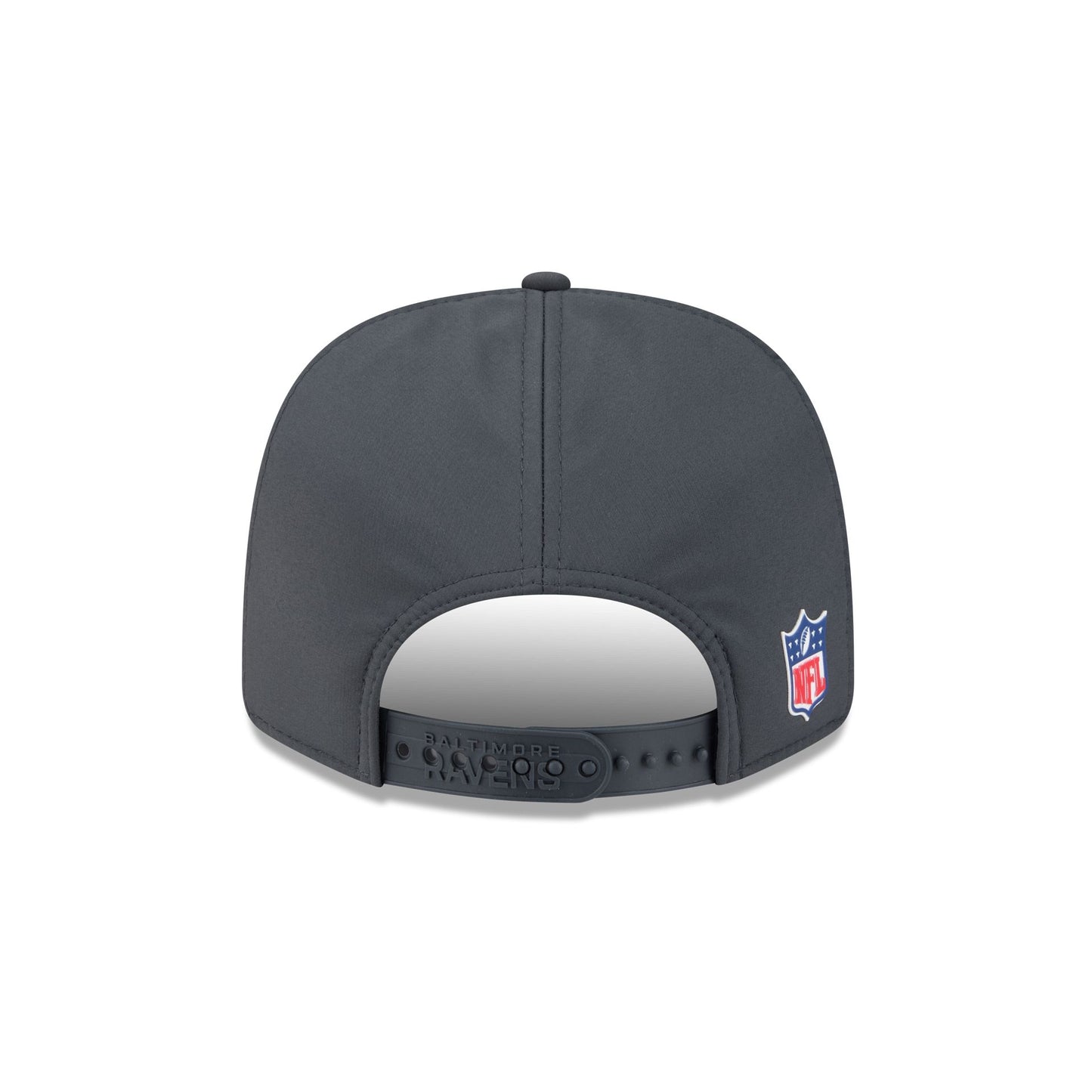 The Baltimore Ravens 2025 Sideline Cold Weather Steel Clouds 9SEVENTY Stretch-Snap features a sewn-down silicone Ravens logo patch at the front panels with a water-repellent quill tech fabrication throughout and an insulated crown with a quick-dry cushioned sweatband. Additional details include the Official NFL Shield logo to the right of a soft silicone snapback closure at the rear. The undervisor is accented with a silicone transfer in the team’s colors.