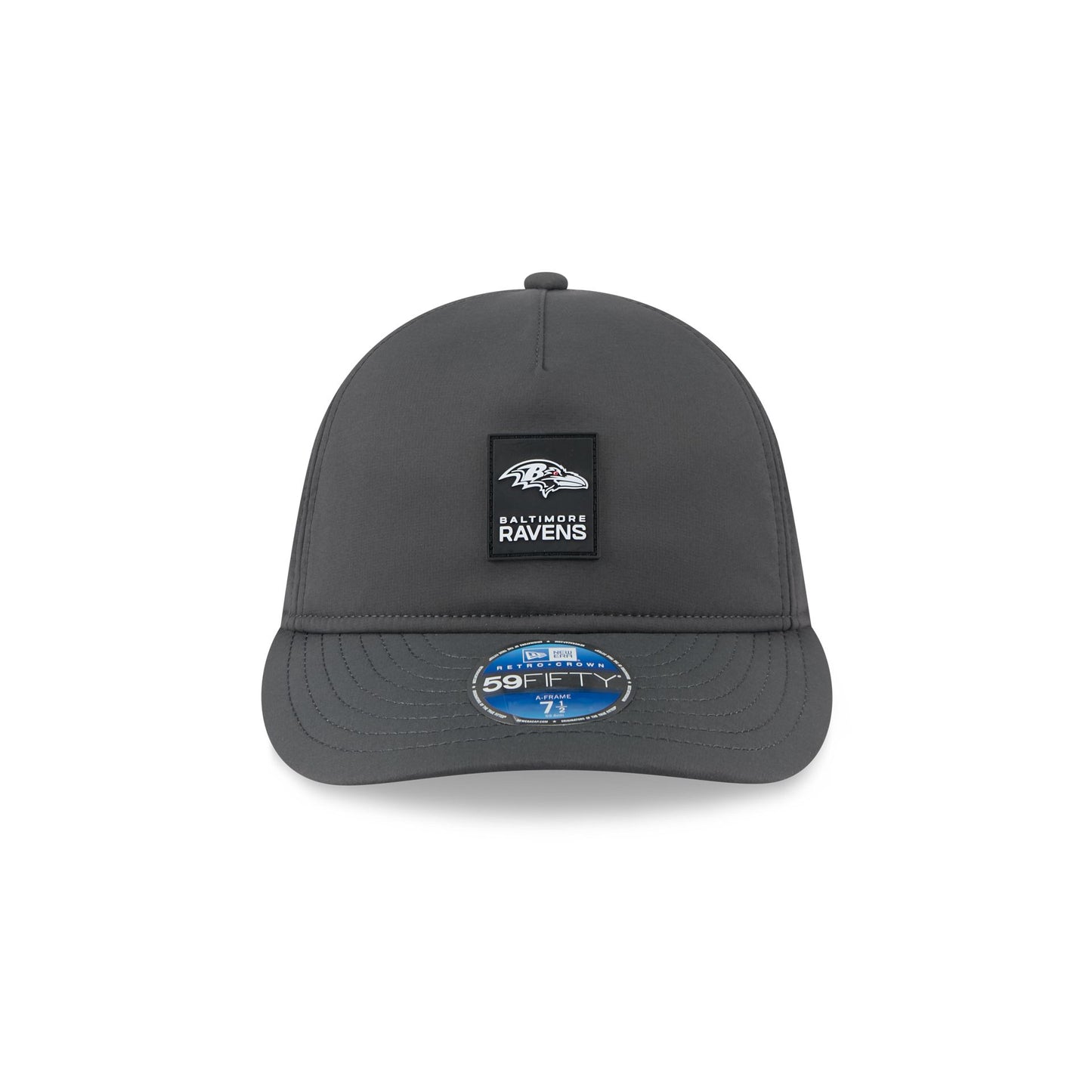 The Baltimore Ravens 2025 Sideline Cold Weather Steel Clouds Retro Crown 59FIFTY A-Frame Fitted Cap features a sewn-down silicone Ravens logo patch at the front panels with the Official NFL Shield logo at the rear. The cap has a water-repellent quill tech fabrication throughout, with an insulated crown and quick-dry cushioned sweatband. The undervisor is accented with a silicone transfer in the team’s colors.