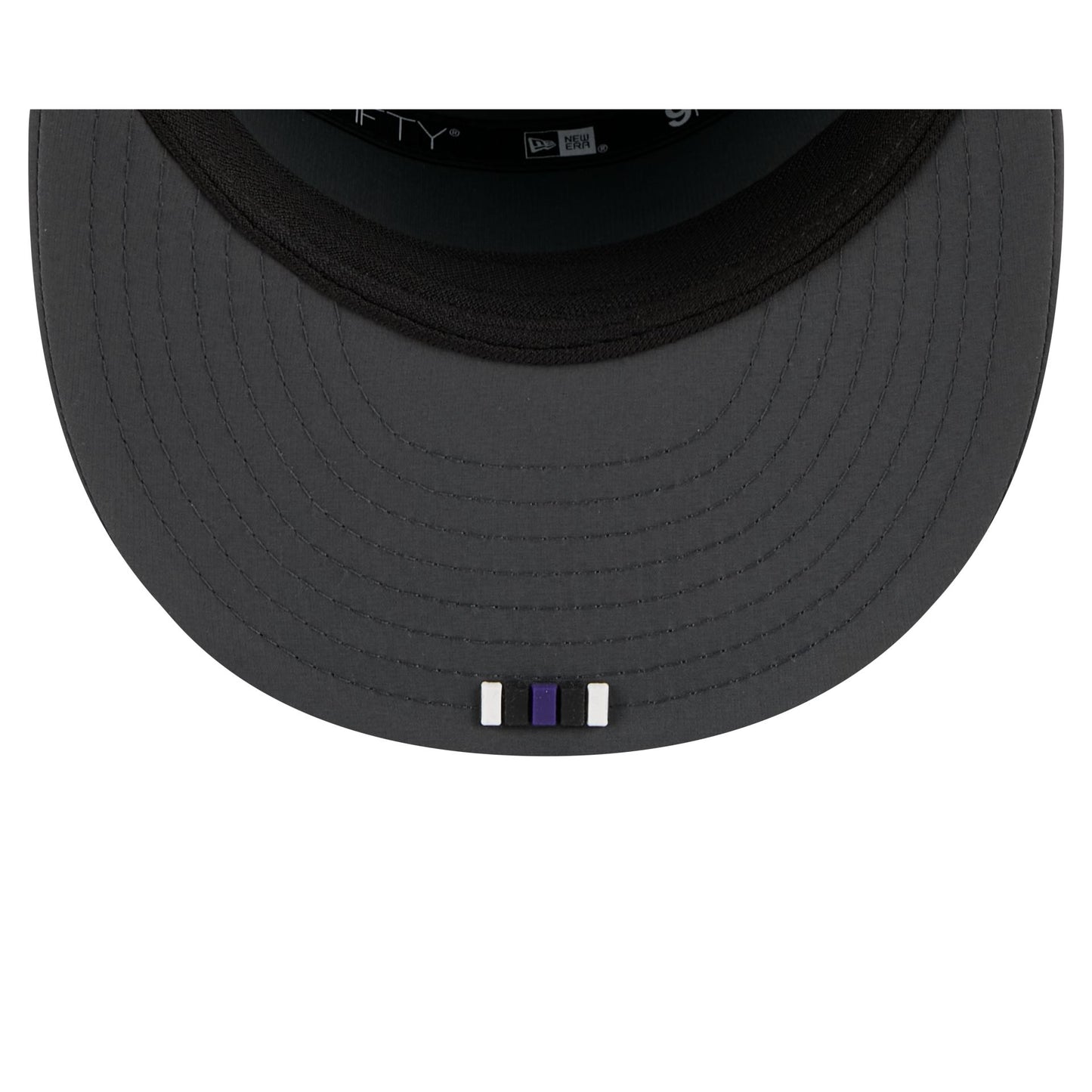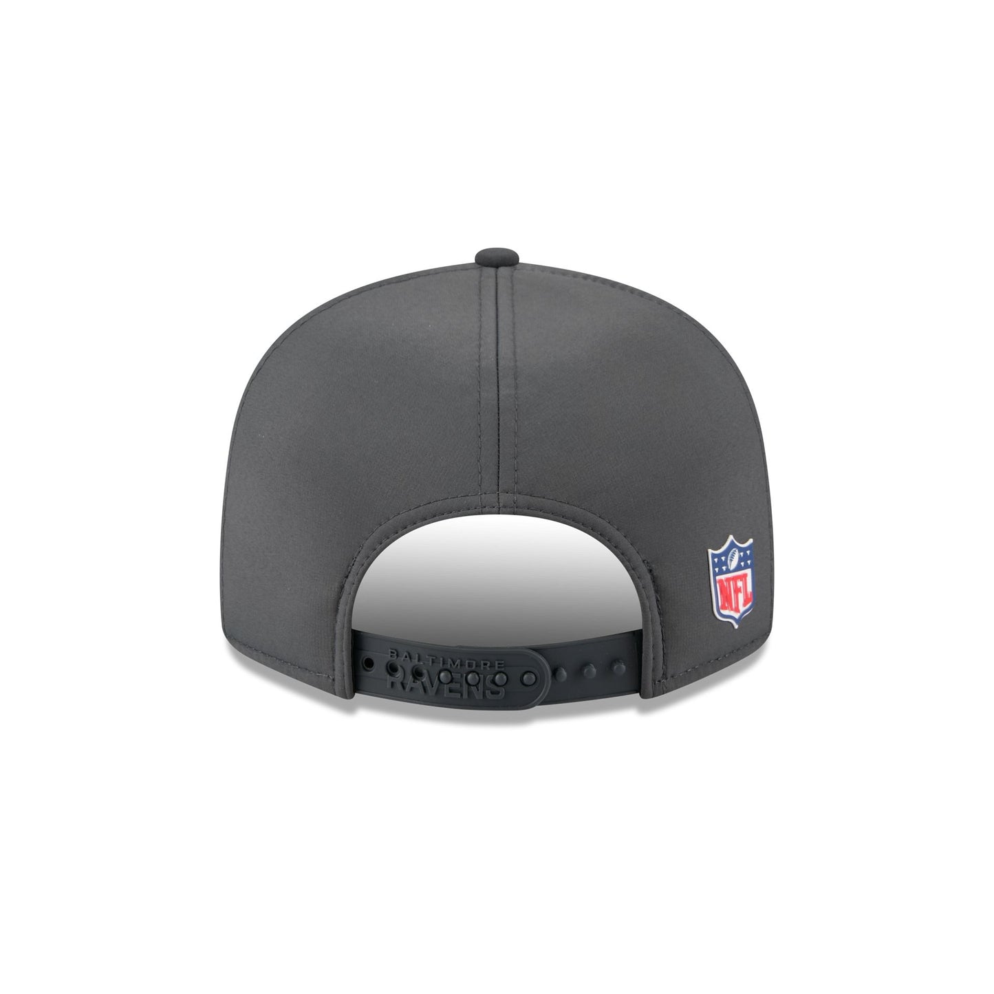 The Baltimore Ravens 2025 Sideline Cold Weather Steel Clouds Split Panel 9FIFTY Snapback features a sewn-down silicone Ravens logo patch at the front panels with a split-crown construction and diamond quilting. The cap has a water-repellent quill tech fabrication throughout, with a quick-dry cushioned sweatband to absorb moisture. Additional details include the Official NFL Shield logo to the right of a soft silicone snapback closure at the rear with eyelets at each side panel. The undervisor is accented with a silicone transfer in the team’s colors.