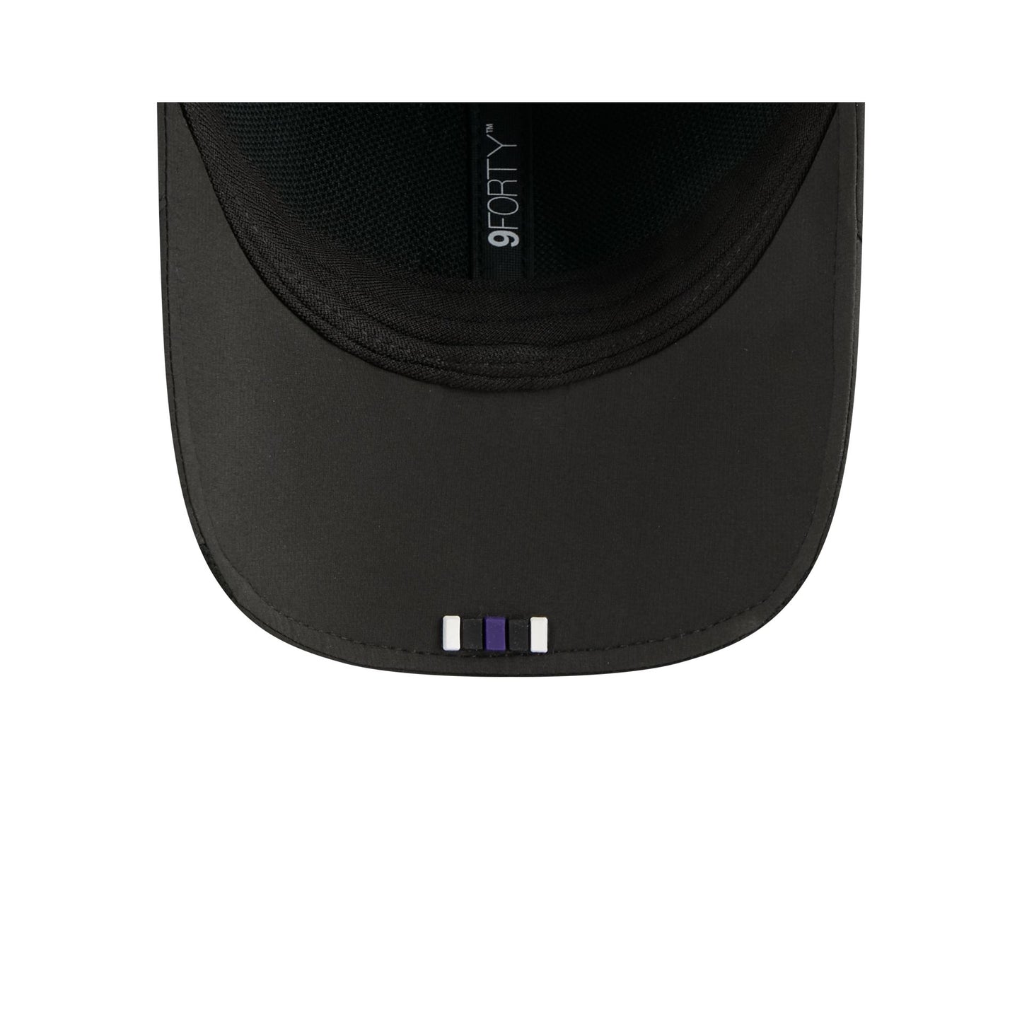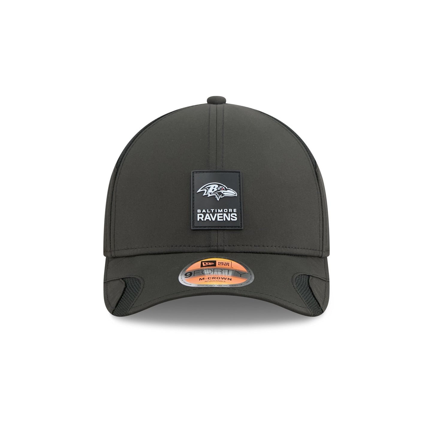 The Baltimore Ravens 2025 Sideline Hot Weather 9FORTY M-Crown Snapback features a sewn-down silicone Ravens logo patch at the front panels with a water-repellent quill tech fabrication throughout and a quick-dry cushioned sweatband to absorb moisture. Additional details include the Official NFL Shield logo to the right of a soft silicone snapback closure at the rear and mesh accents at the visor sides and side crown panels. The undervisor is accented with a silicone transfer in the team’s colors.