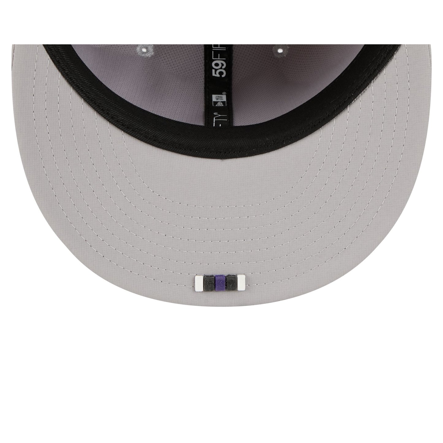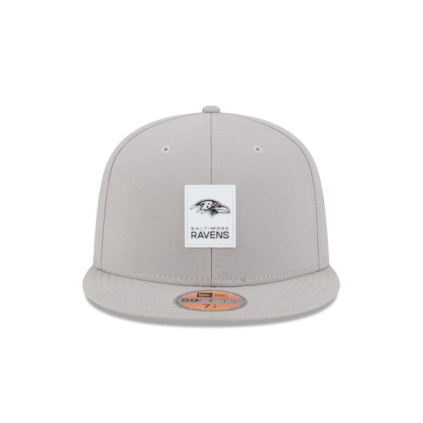 The Baltimore Ravens 2025 Sideline Hot Weather Gray 59FIFTY Fitted Cap features a sewn-down silicone Ravens logo patch at the front panels with a matching Official NFL Shield logo at the rear. The cap has a water-repellent quill tech fabrication throughout, with a quick-dry cushioned sweatband to absorb moisture. The undervisor is accented with a silicone transfer in the team’s colors.