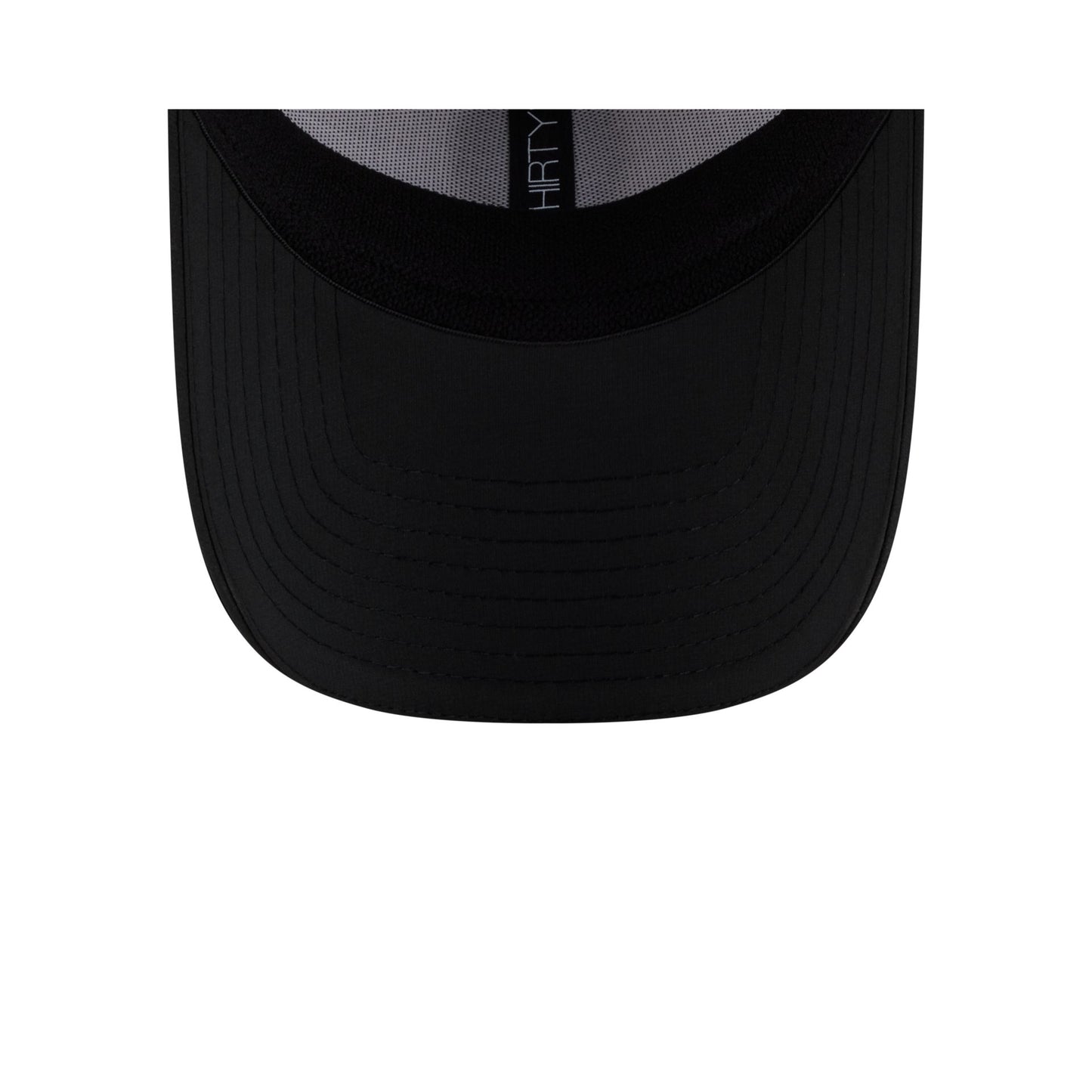 The Baltimore Ravens 2025 Training 39THIRTY Stretch Fit Cap features a silicone Ravens patch at the front panels with team color stripes at the front of a black visor and a silicone NFL Shield patch at the rear.
