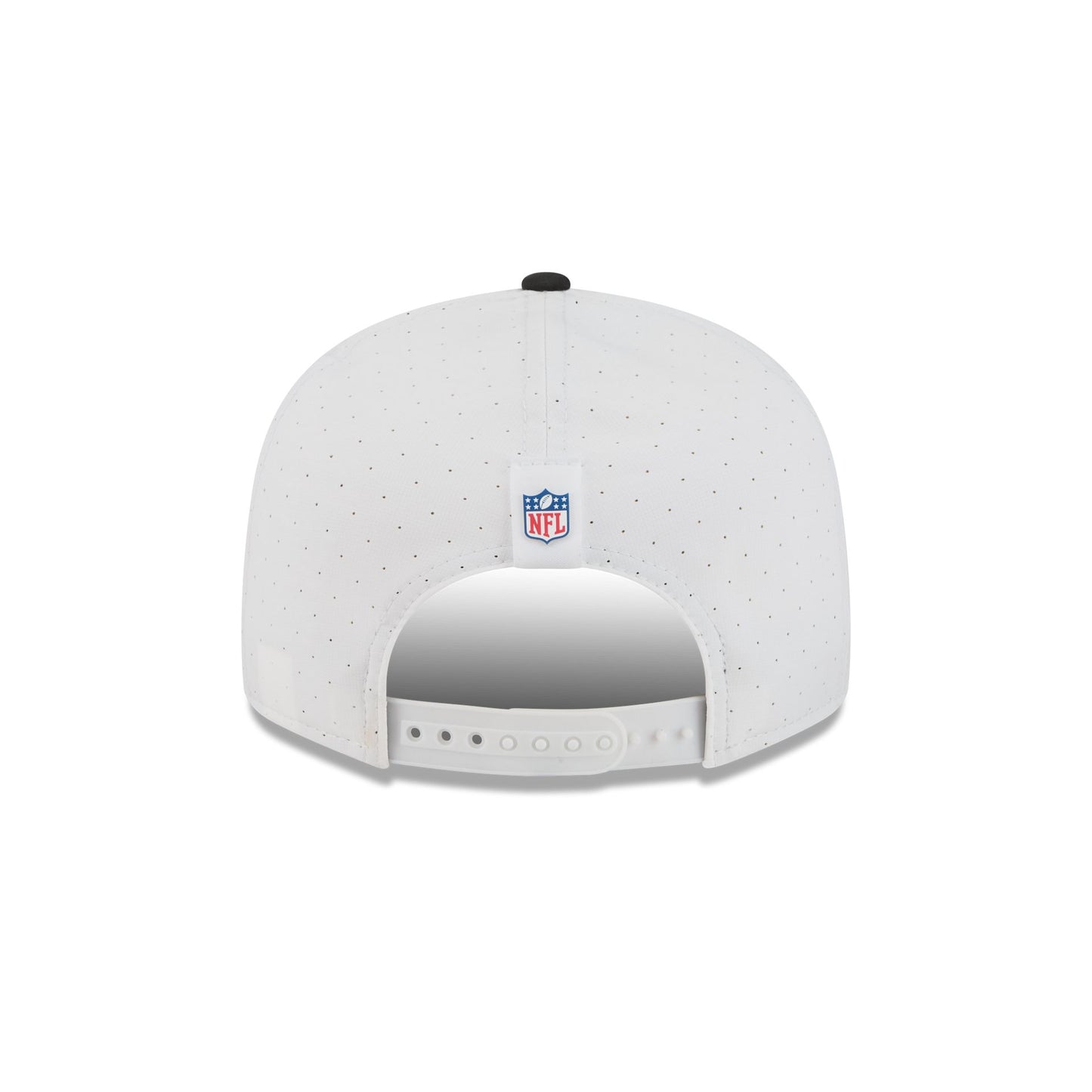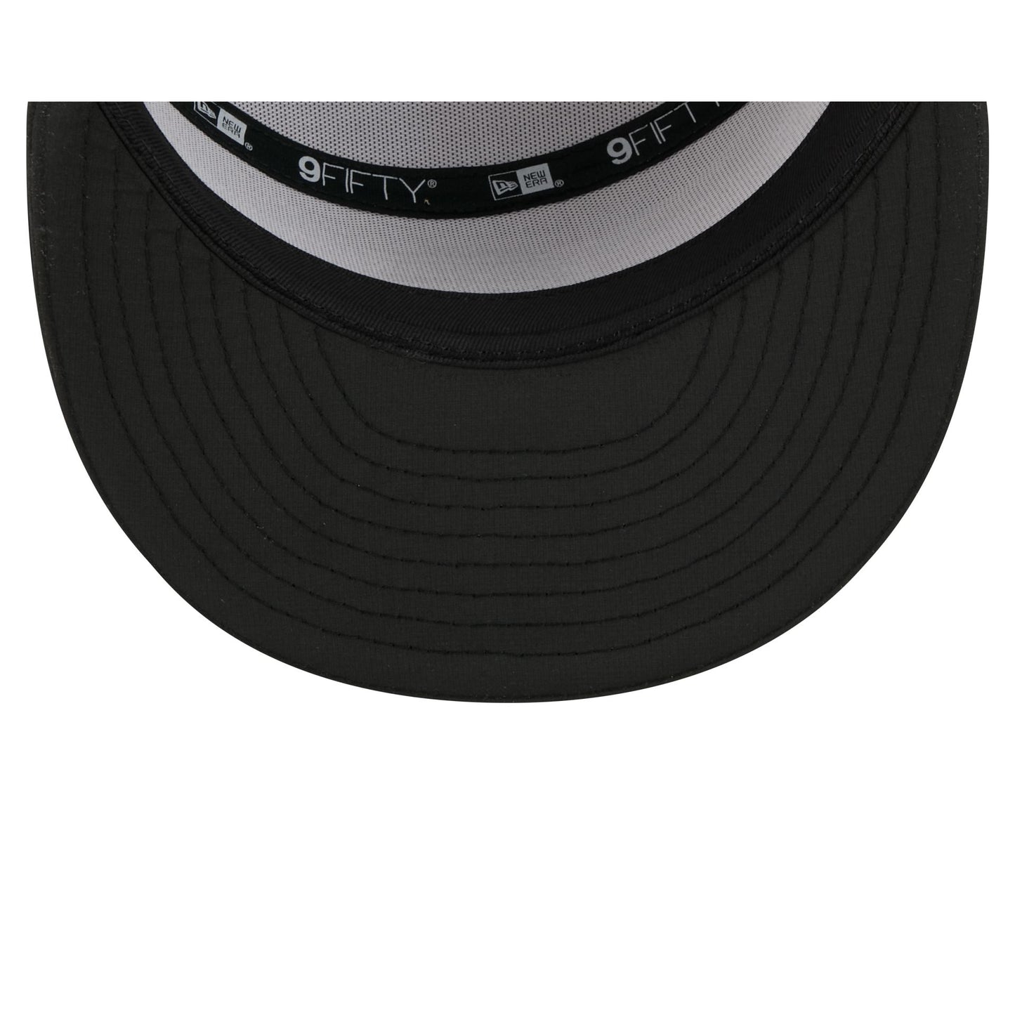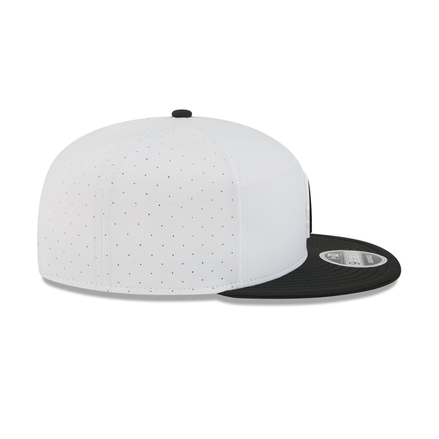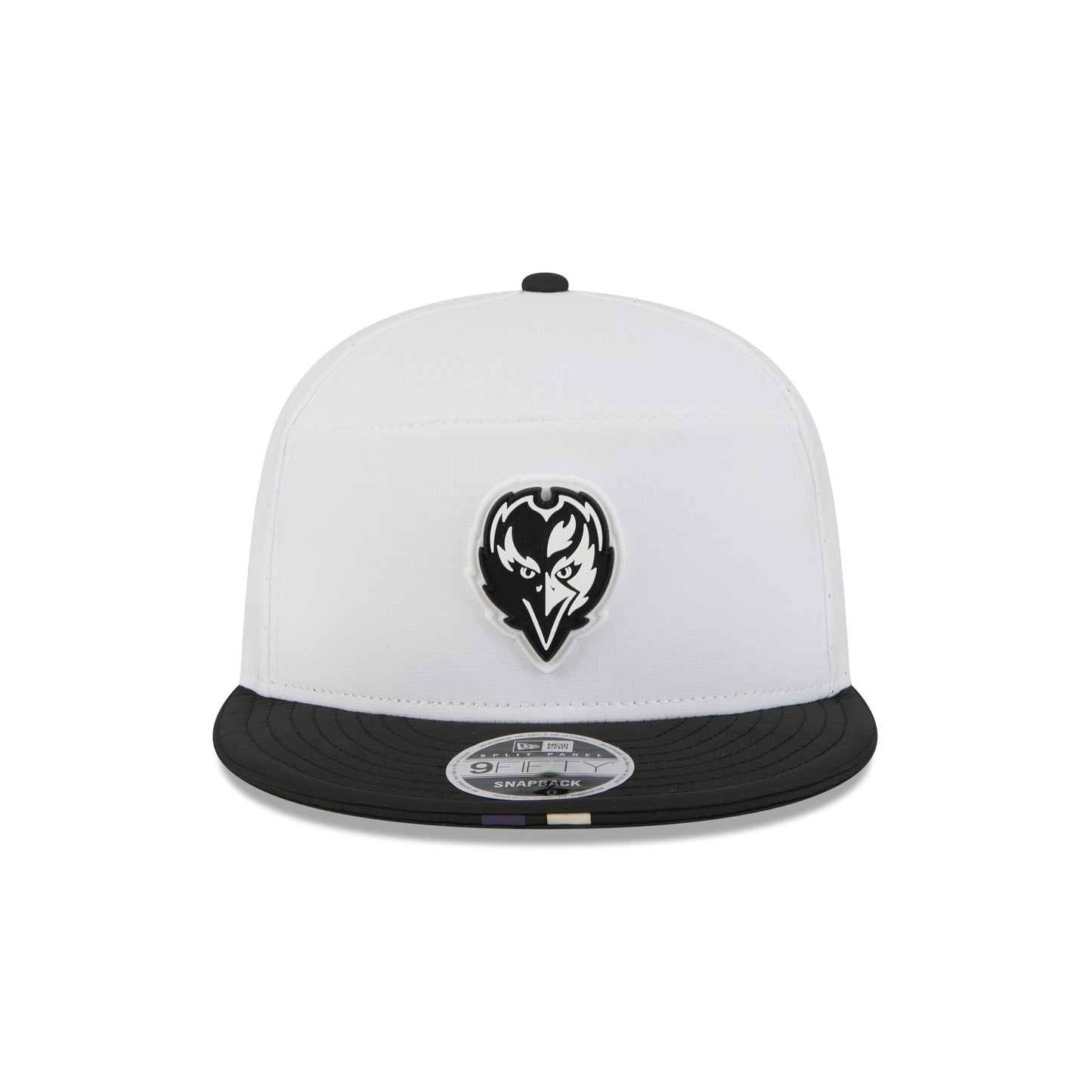 The Baltimore Ravens 2025 Training Split Panel 9FIFTY Snapback features a silicone Ravens patch at the front panel with team color stripes at the front of a black visor. Additional details include a silicone NFL Shield patch on a woven foldover tab above a snapback closure at the rear.