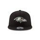 The Baltimore Ravens Black and White 9FIFTY Snapback features an embroidered black and white Ravens logo at the front panels and an adjustable snapback closure at the rear.