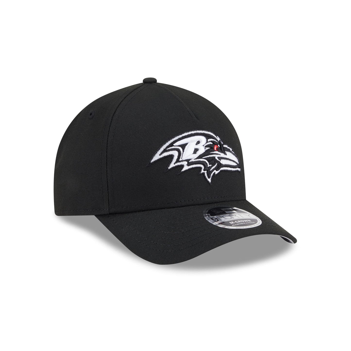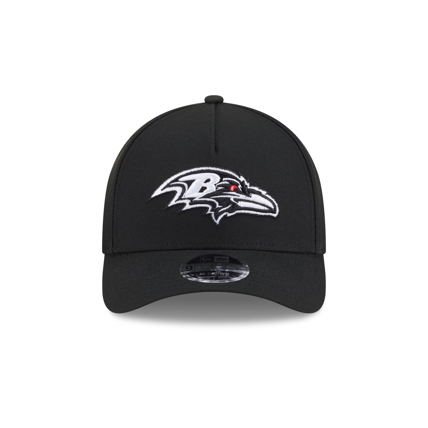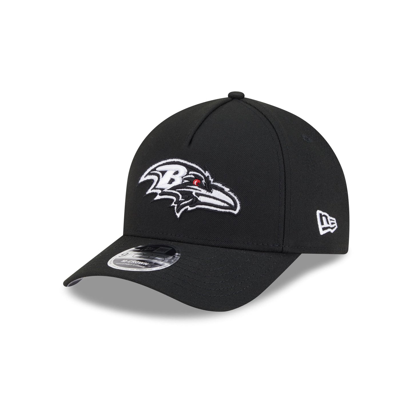 The Baltimore Ravens Black & White 9FORTY M-Crown A-Frame Snapback features an embroidered Ravens logo at the front panels with an adjustable snapback closure at the rear and a gray undervisor.