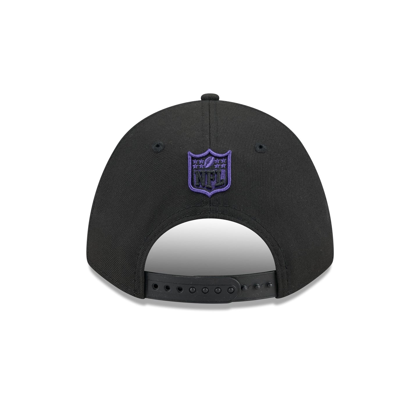 The Baltimore Ravens Team 9FORTY M-Crown Snapback features an embroidered Ravens logo at the front panels with a matching NFL Shield logo above an adjustable snapback closure at the rear and a gray undervisor.
