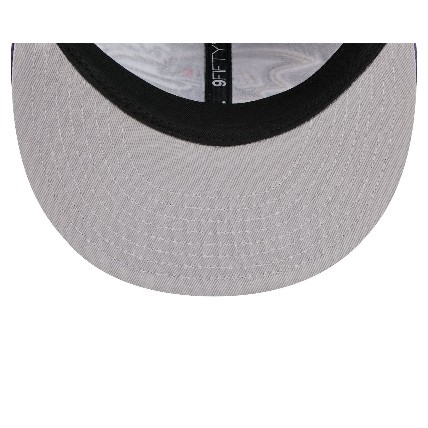 The Baltimore Ravens Tidal Flow Retro Crown 9FIFTY Adjustable Cap features an embroidered Ravens logo at the front panels with tidal waves throughout the cap. Additional details include an adjustable snapback closure at the rear and a gray undervisor.