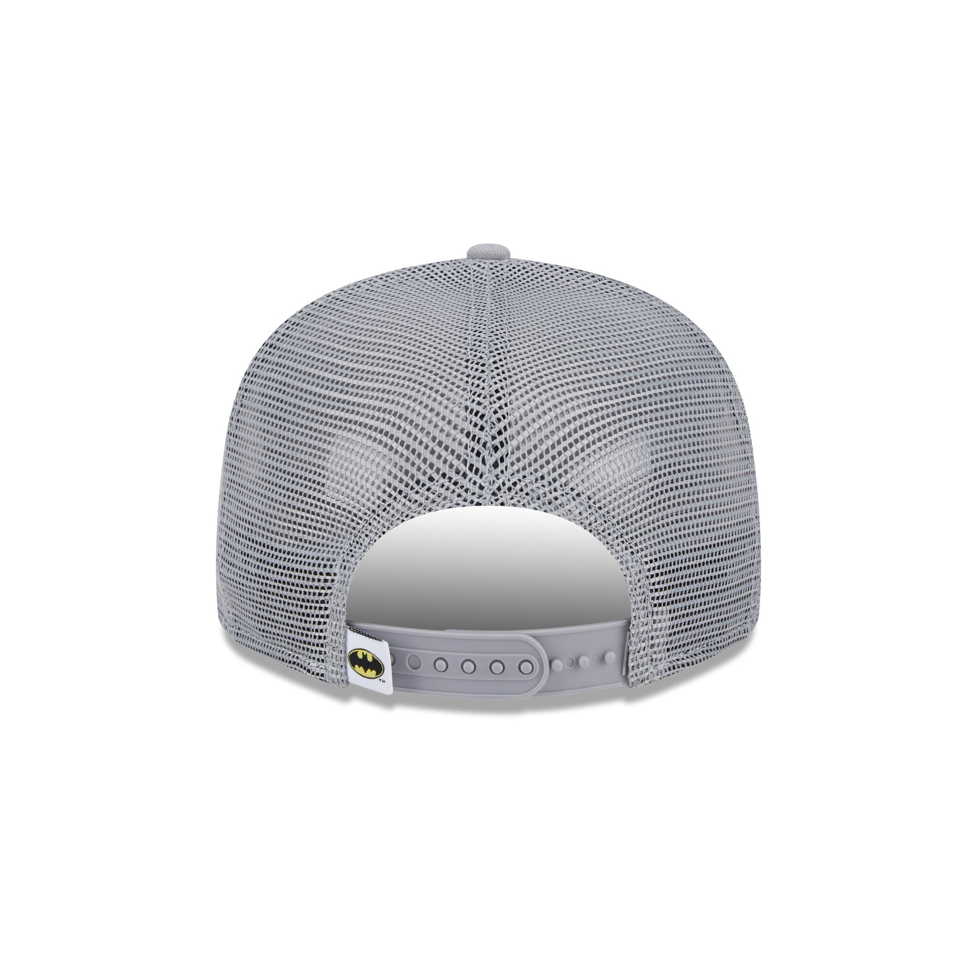 The Batman Team Tag 9FIFTY Trucker features an embroidered Batman logo at the front panels with a team tag on a snapback closure at a mesh rear and a gray undervisor.