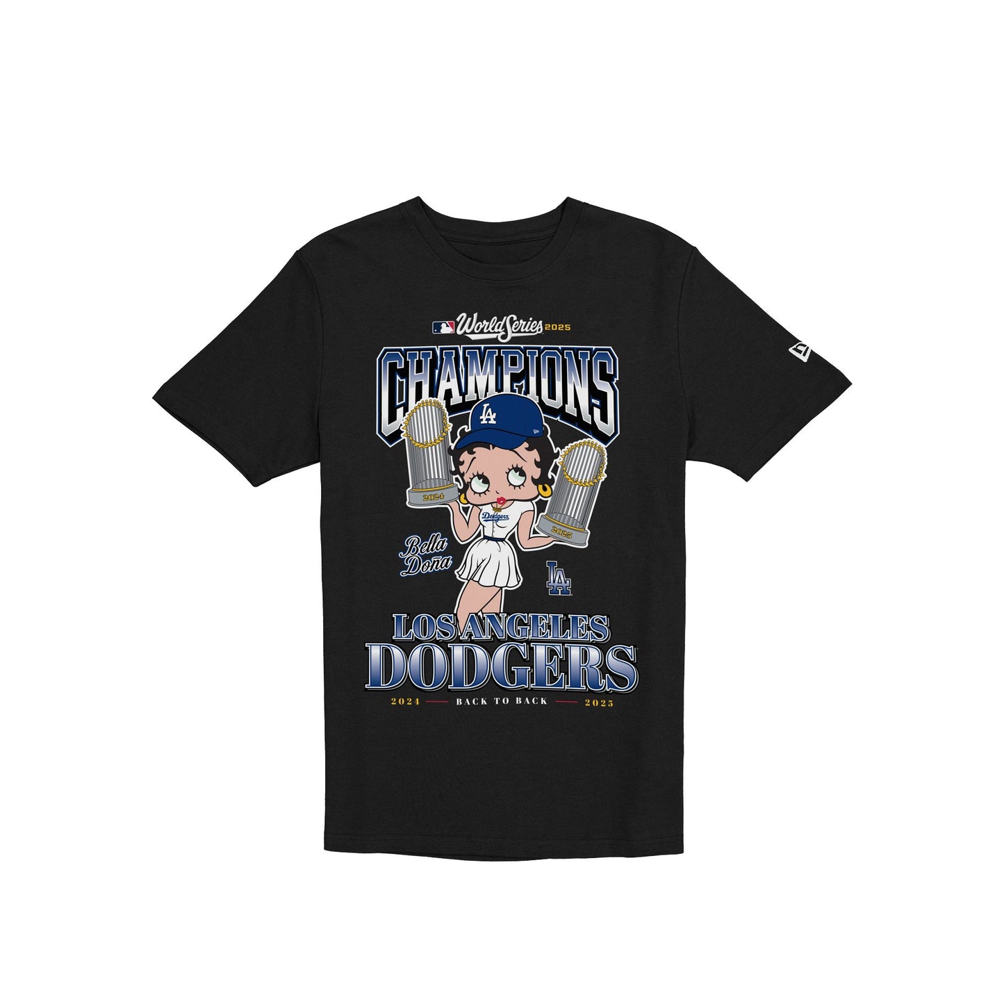 The Bella Doña x Betty Boop x Los Angeles Dodgers 2025 World Series Champions Black T-Shirt features a screen-printed Bella Doña x Betty Boop x Los Angeles Dodgers 2025 World Series Champions graphic at the front.