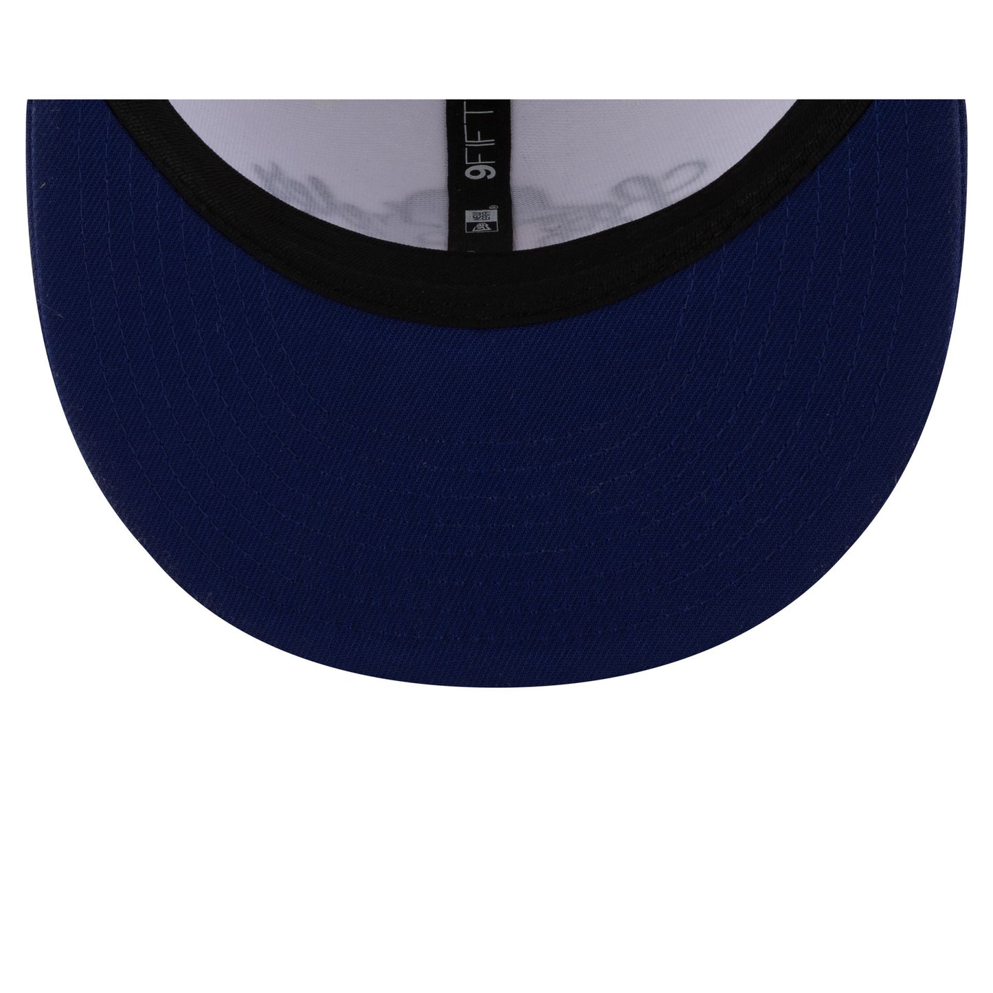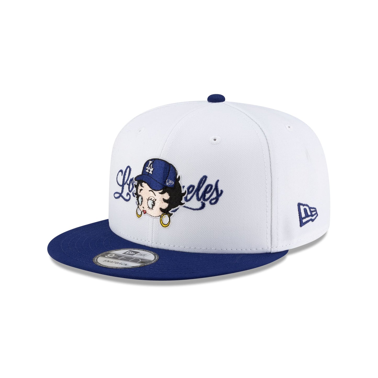 The Bella Doña x Betty Boop x Los Angeles Dodgers 9FIFTY Snapback features an embroidered Betty Boop wearing a Dodgers cap over a Los Angeles script at the front panels with a matching Bella Doña script at the right-wear side. Additional details include a monochromatic Dodgers logo above a snapback closure at the rear and a blue visor.