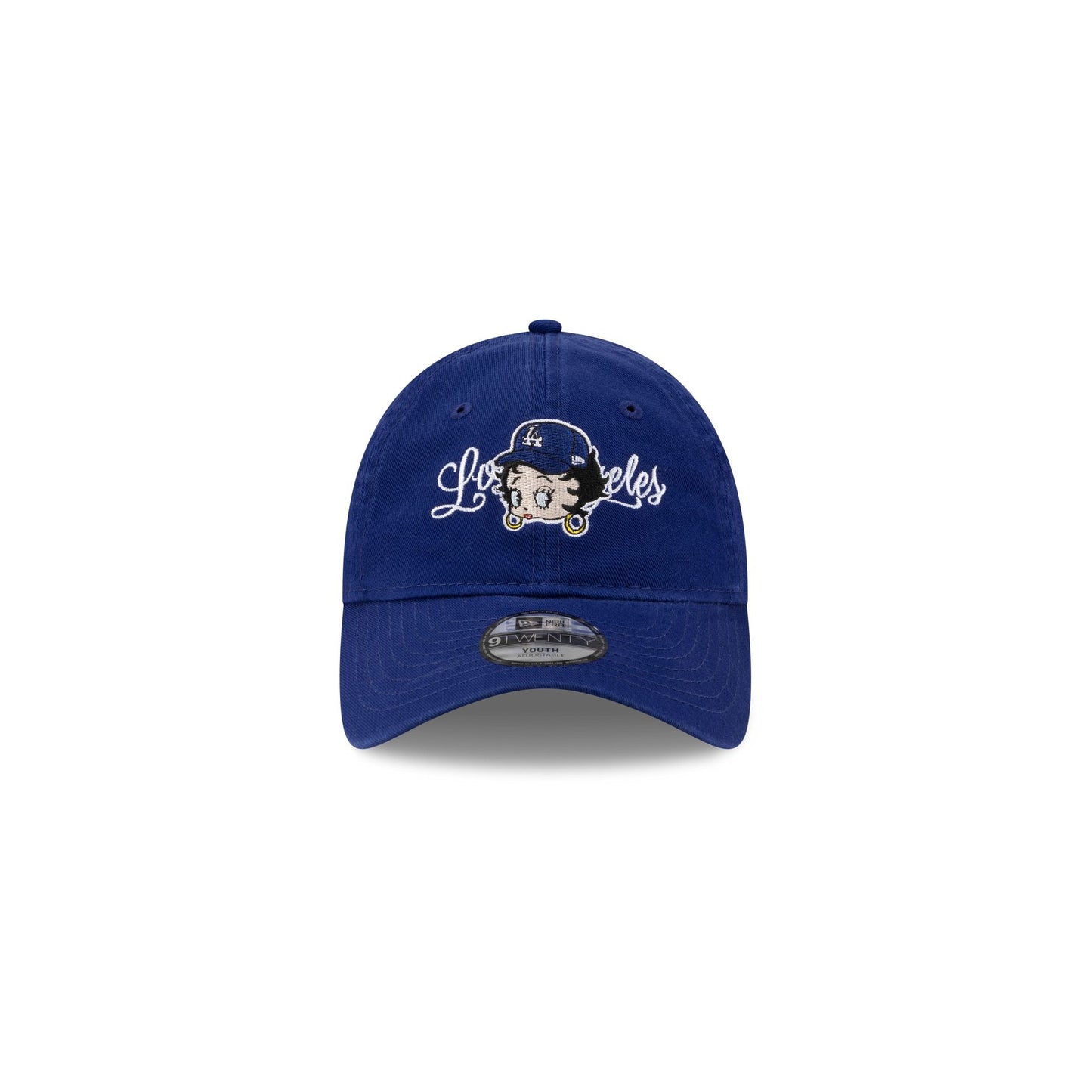 The Bella Doña x Betty Boop x Los Angeles Dodgers Kids 9TWENTY Adjustable Cap features an embroidered Dodgers cap over a Los Angeles script at the front panels with a matching Bella Doña script at the right-wear side. Additional details include a monochromatic Dodgers logo above an adjustable D-Ring closure at the rear and a gray undervisor.