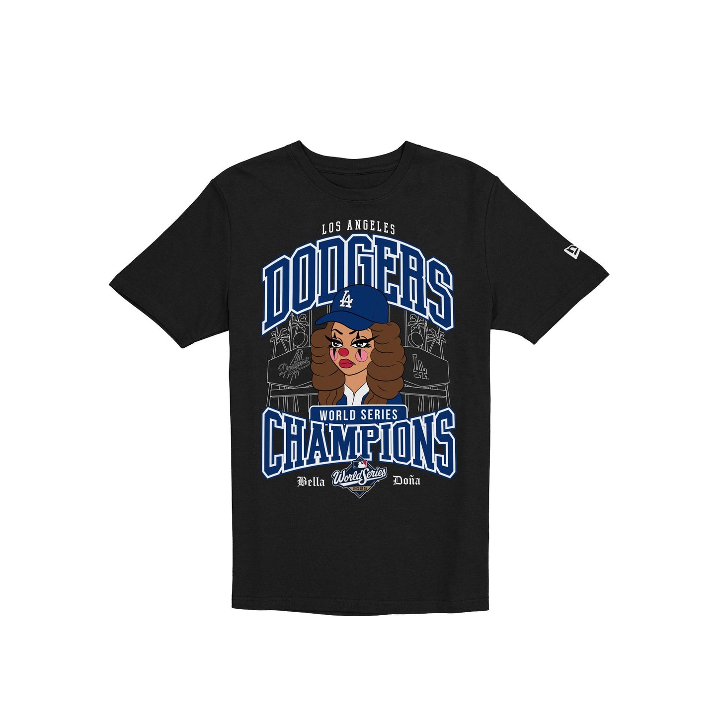 The Bella Doña x Los Angeles Dodgers 2025 World Series Champions Character Black T-Shirt features a screen-printed Bella Doña x Los Angeles Dodgers 2025 World Series Champions graphic at the front.