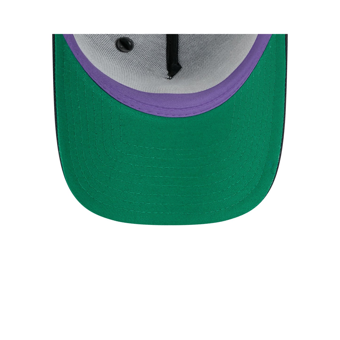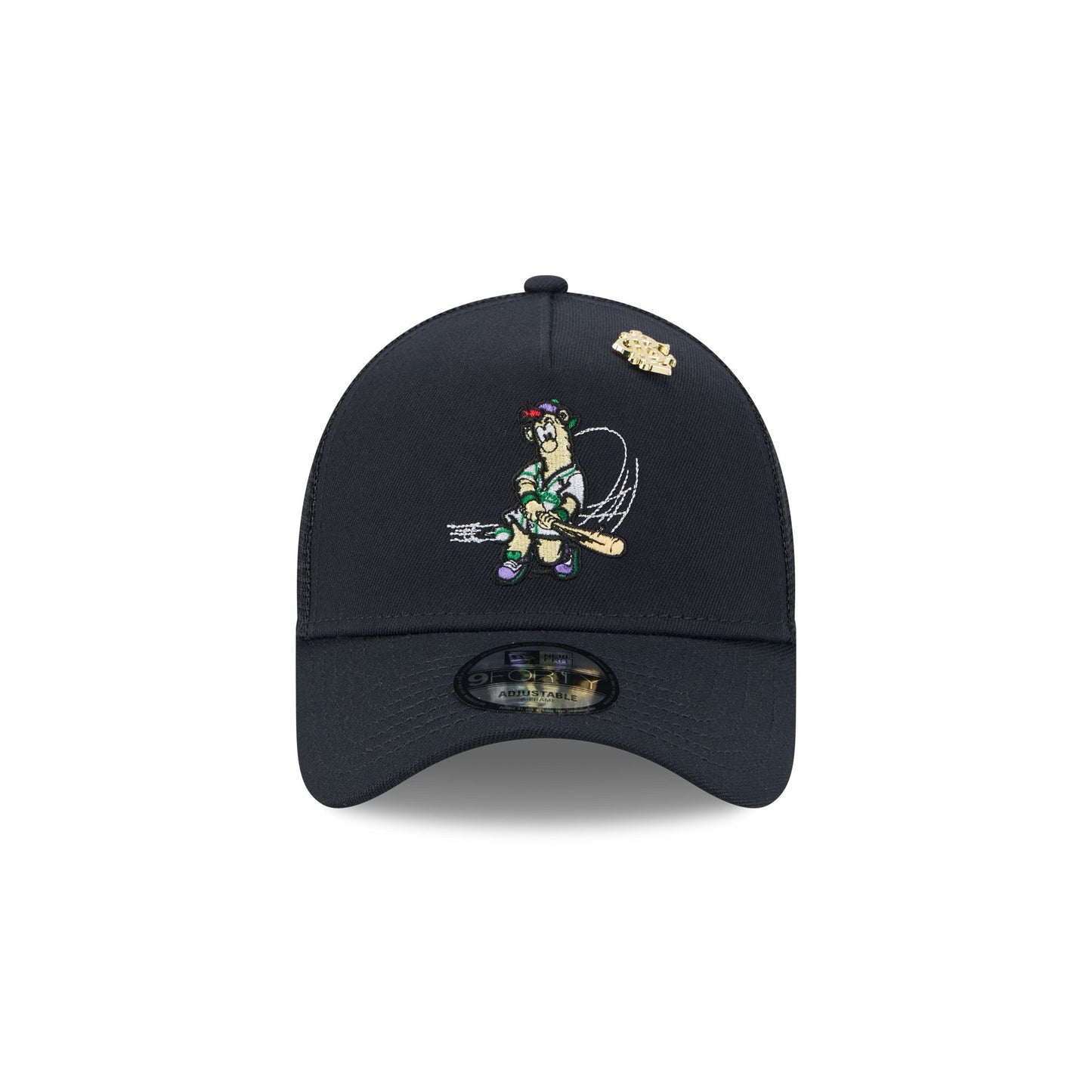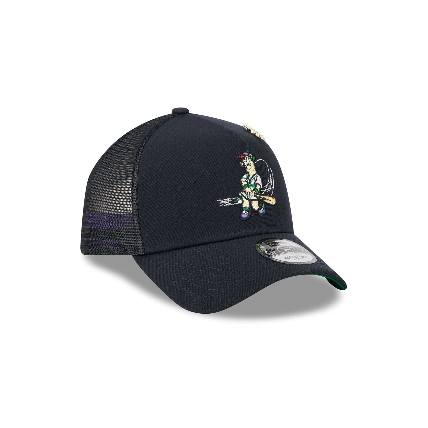 The Big League Chew x Atlanta Braves 9FORTY A-Frame Trucker features an embroidered Braves mascot and a Big League Chew pin at the front panel with an adjustable snapback closure at the rear and green undervisor.