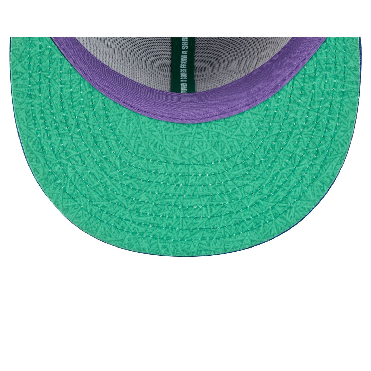 The Big League Chew x Chicago Cubs 59FIFTY Fitted Cap features an embroidered Cubs logo and a Big League Chew pin at the front panels with a matching MLB Batterman logo at the rear. Additional details include a Ground Ball Grape patch at the right-wear side and a green visor.