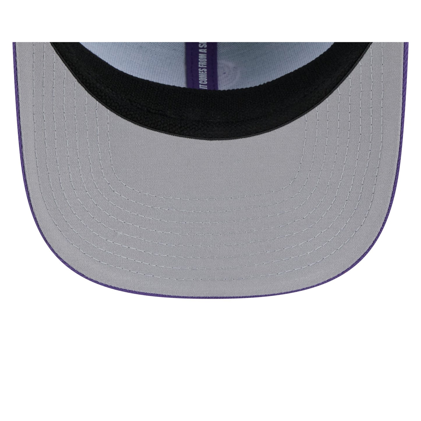The Big League Chew X Chicago White Sox Ground Ball Grape 9SEVENTY Stretch-Snap features an embroidered White Sox logo and a Big League Chew Ground Ball Grape pin at the front panels. Additional details include a Big League Chew logo at the right-wear side, a purple visor, and gray undervisor.