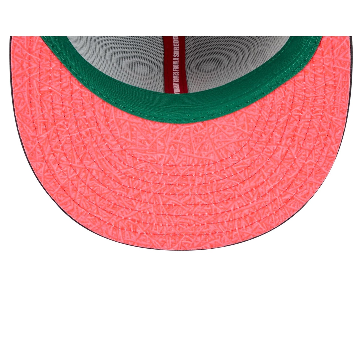 The Big League Chew x Houston Astros 59FIFTY Fitted Cap features an embroidered Astros logo and a Big League Chew pin at the front panels with a matching MLB Batterman logo at the rear. Additional details include a Wild Pitch Watermelon patch at the right-wear side and a pink visor.