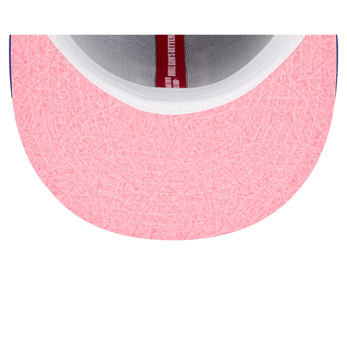The Big League Chew x Kansas City Royals 59FIFTY Fitted Cap features an embroidered Royals logo and a Big League Chew pin at the front panels with a matching MLB Batterman logo at the rear. Additional details include a Outta Here Original patch at the right-wear side and a pink visor.