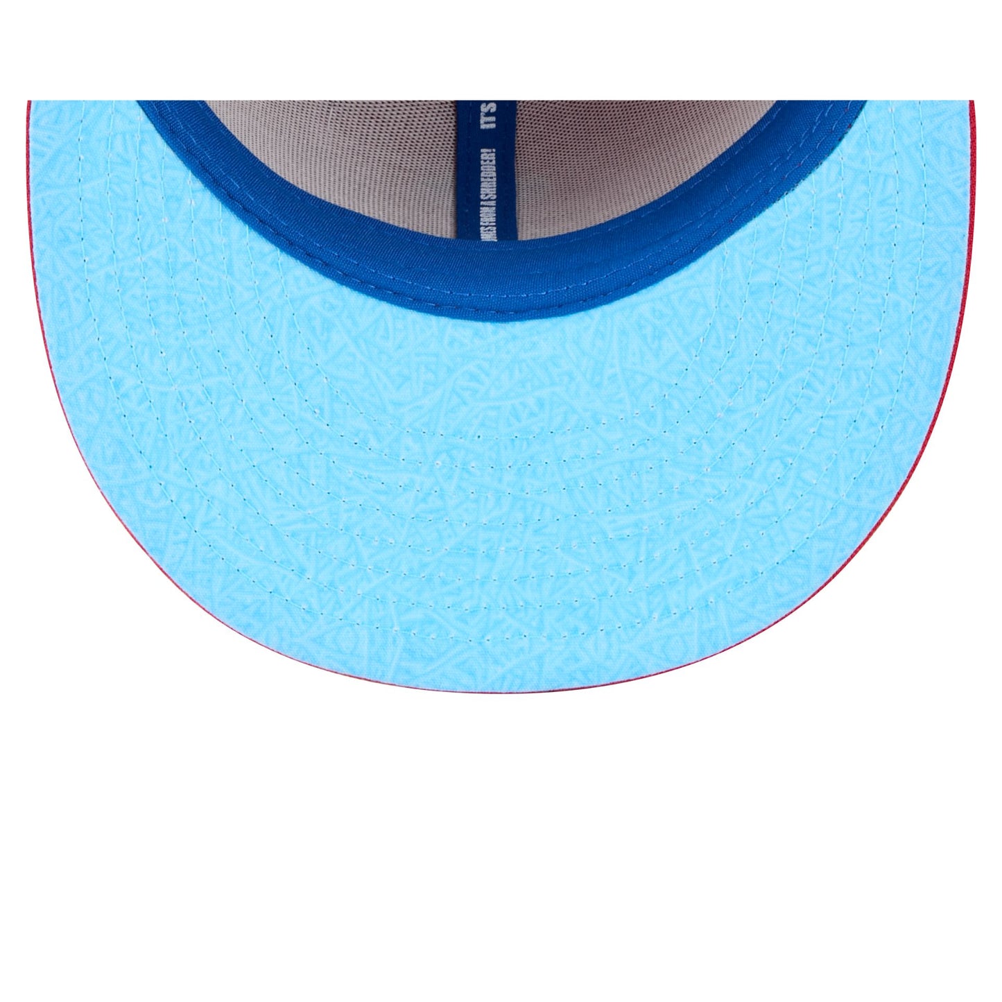 The Big League Chew x Los Angeles Angels 59FIFTY Fitted Cap features an embroidered Angels logo and a Big League Chew pin at the front panels with a matching MLB Batterman logo at the rear. Additional details include a Big Rally Blue Raspberry patch at the right-wear side and a blue visor.