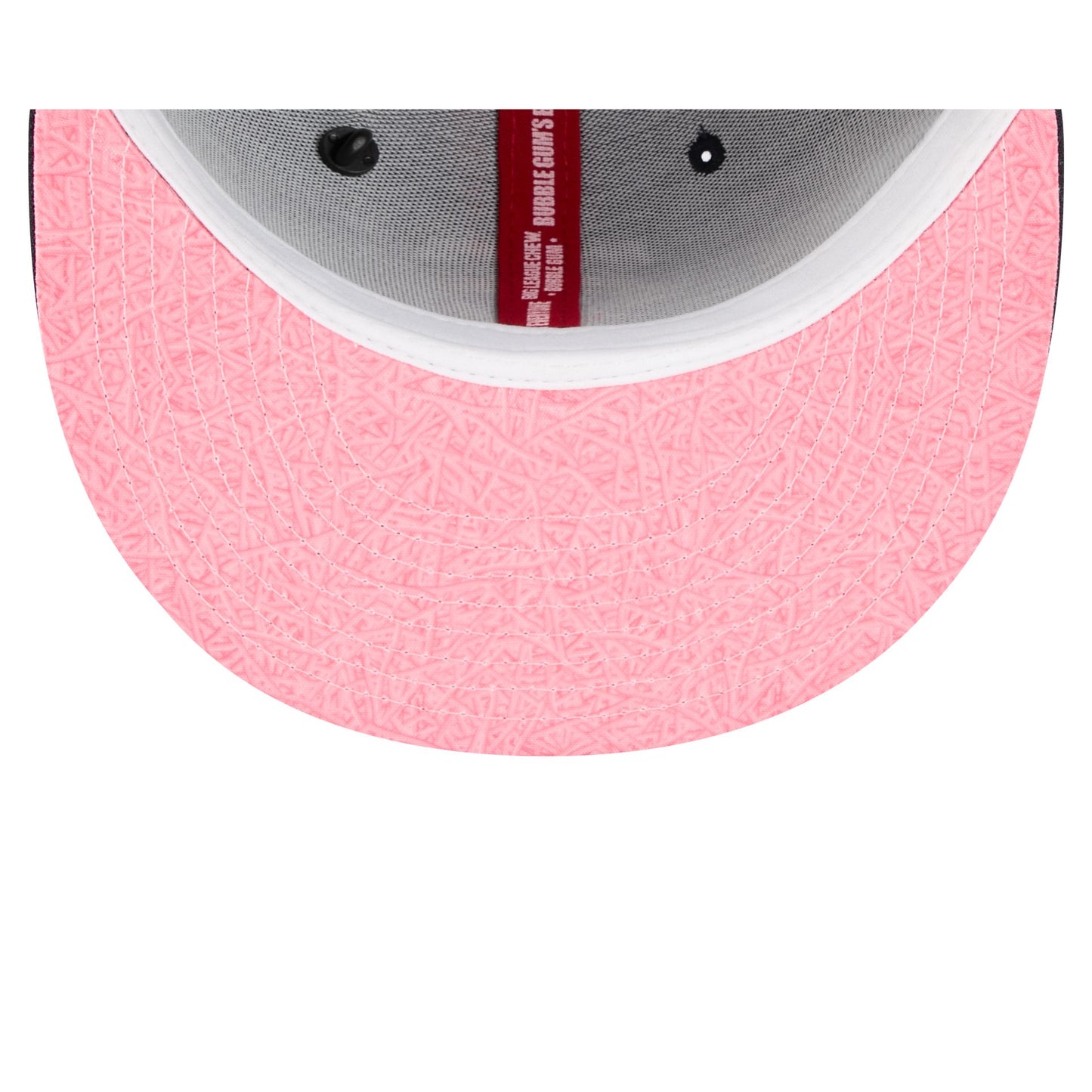 The Big League Chew x Minnesota Twins 59FIFTY Fitted Cap features an embroidered Twins logo and a Big League Chew pin at the front panels with a matching MLB Batterman logo at the rear. Additional details include a Outta Here Original patch at the right-wear side and a pink visor.