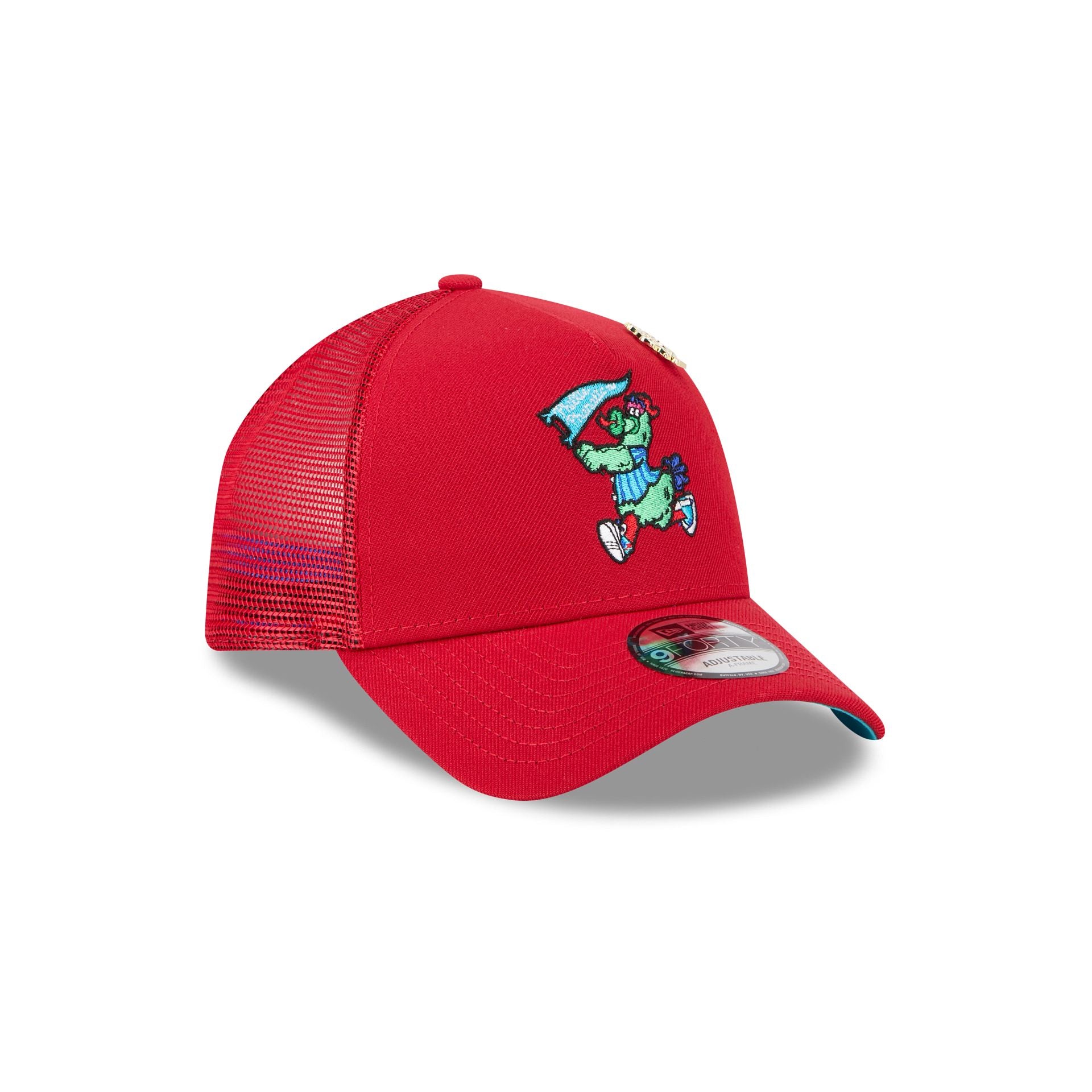The Big League Chew x Philadelphia Phillies 9FORTY A-Frame Trucker features an embroidered Phillies mascot and a Big League Chew pin at the front panel with an adjustable snapback closure at the rear and blue undervisor.