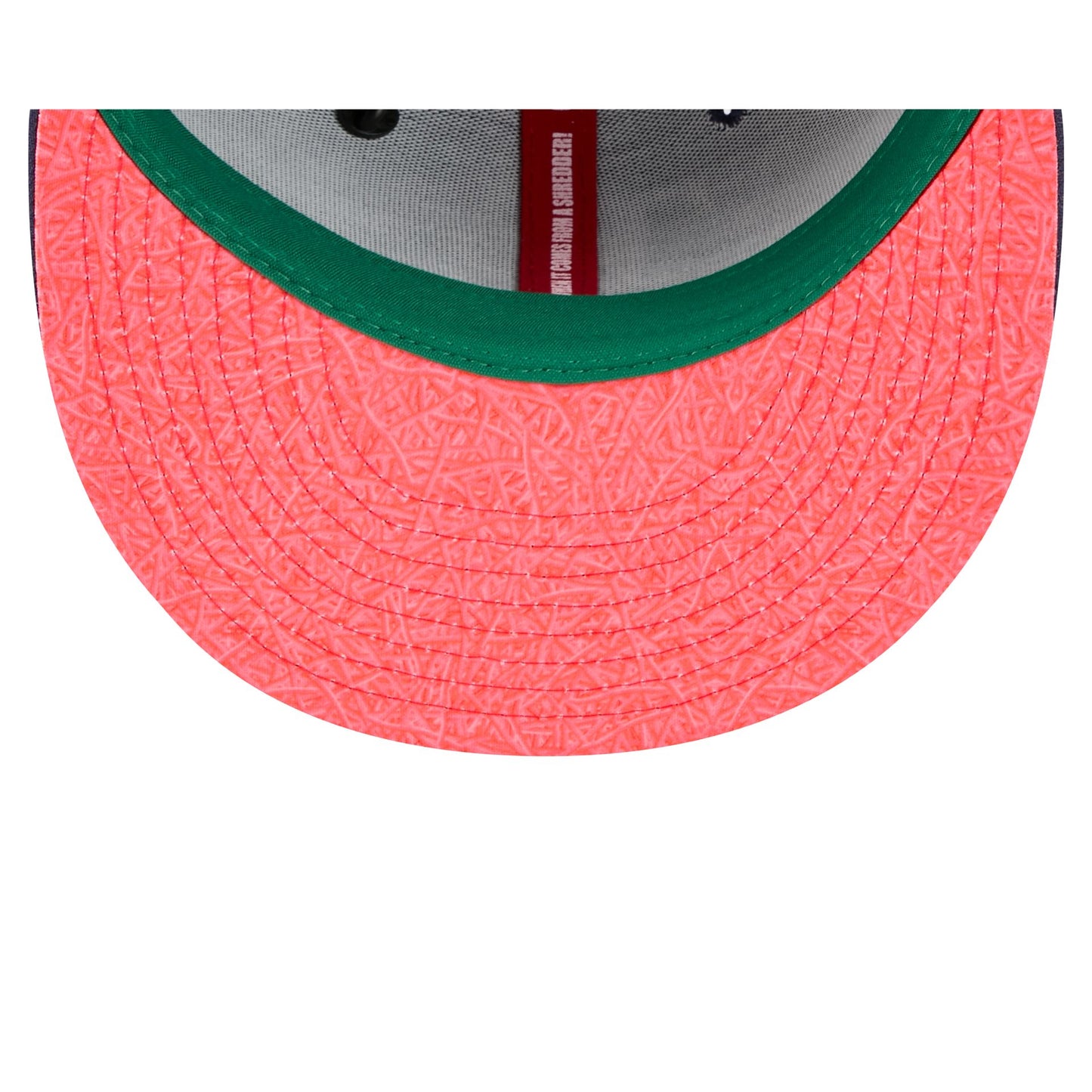 The Big League Chew x Tampa Bay Rays 59FIFTY Fitted Cap features an embroidered Rays logo and a Big League Chew pin at the front panels with a matching MLB Batterman logo at the rear. Additional details include a Wild Pitch Watermelon patch at the right-wear side and a pink visor.