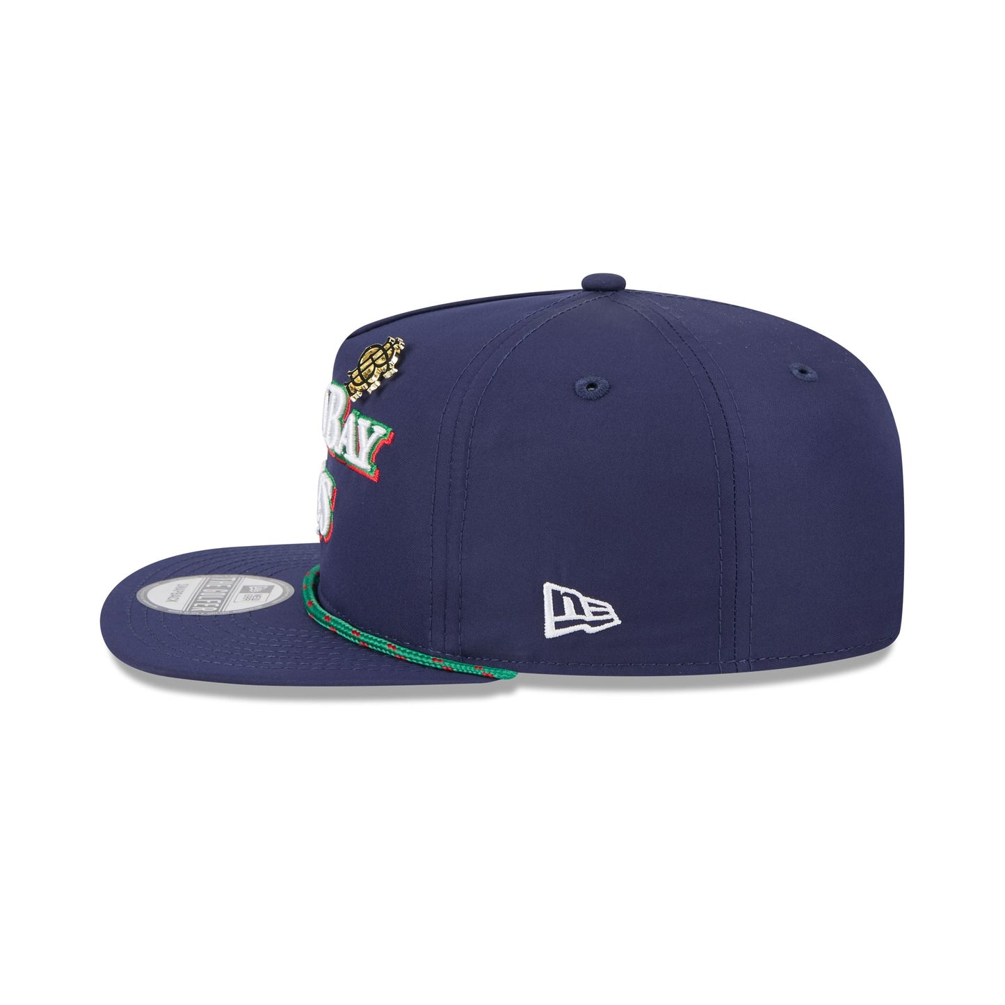 The Big League Chew x Tampa Bay Rays Golfer features an embroidered Rays wordmark and a Big League Chew pin at the front panel with an adjustable snapback closure at the rear and a red undervisor.