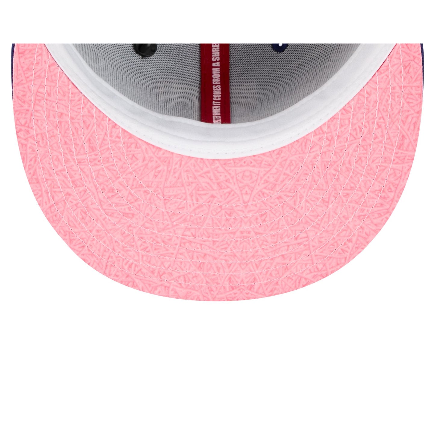 The Big League Chew x Texas Rangers 59FIFTY Fitted Cap features an embroidered Rangers logo and a Big League Chew pin at the front panels with a matching MLB Batterman logo at the rear. Additional details include a Outta Here Original patch at the right-wear side and a pink visor.