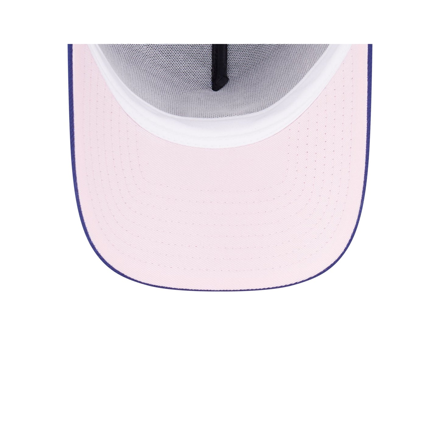 The Big League Chew x Texas Rangers 9FORTY A-Frame Trucker features an embroidered Rangers mascot and a Big League Chew pin at the front panel with an adjustable snapback closure at the rear and pink undervisor.