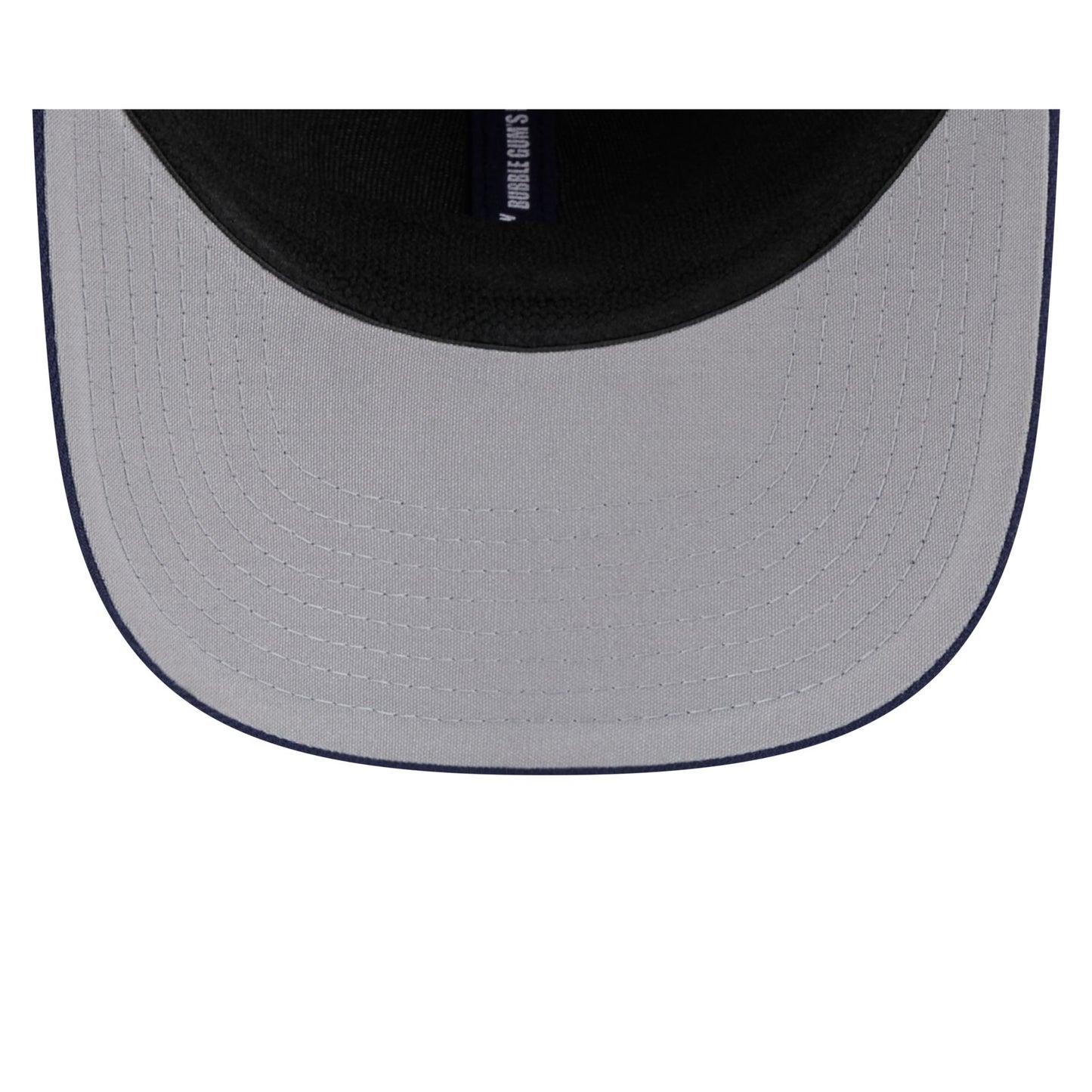 The Big League Chew X Texas Rangers Big Rally Blue Raspberry 9SEVENTY Stretch-Snap features an embroidered Rangers logo and a Big League Chew Big Rally Blue Raspberry pin at the front panels. Additional details include a Big League Chew logo at the right-wear side, a navy visor, and gray undervisor.