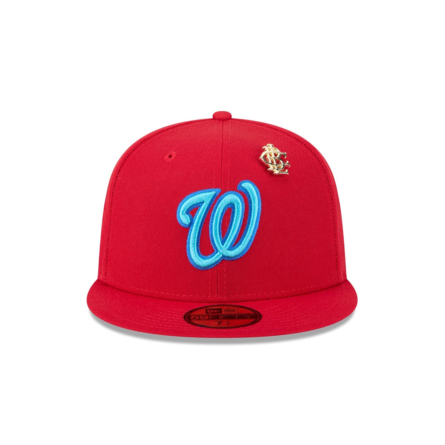 The Big League Chew x Washington Nationals 59FIFTY Fitted Cap features an embroidered Nationals logo and a Big League Chew pin at the front panels with a matching MLB Batterman logo at the rear. Additional details include a Big Rally Blue Raspberry patch at the right-wear side and a blue visor.