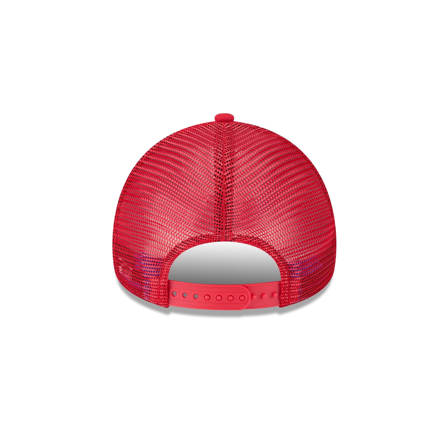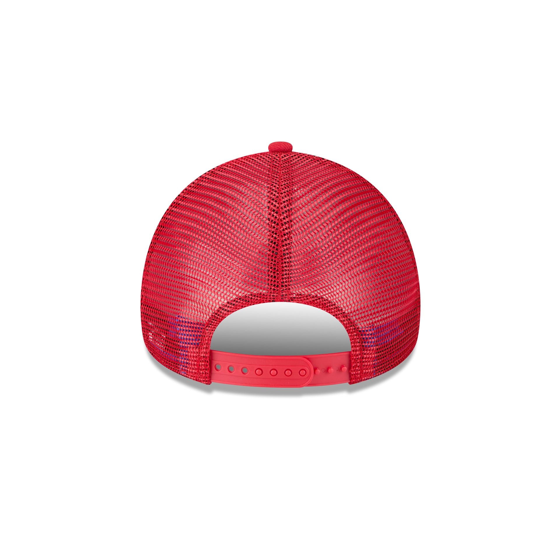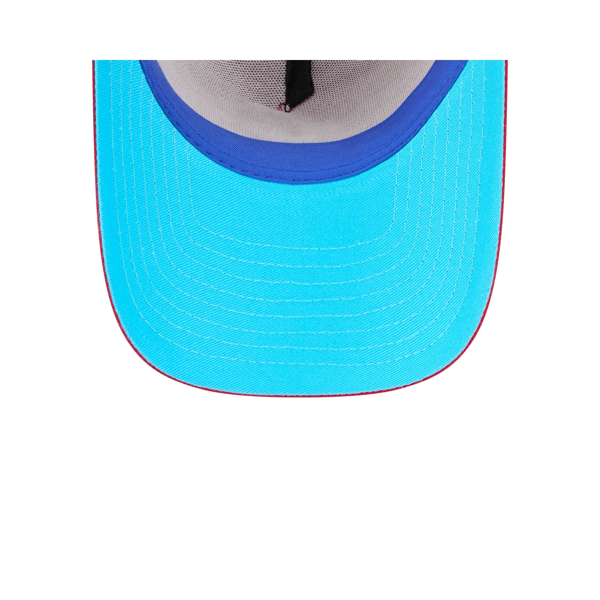 The Big League Chew x Washington Nationals 9FORTY A-Frame Trucker features an embroidered Nationals mascot and a Big League Chew pin at the front panel with an adjustable snapback closure at the rear and blue undervisor.
