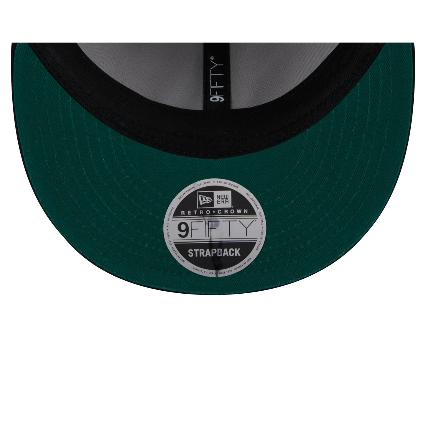 The Birmingham Black Barons Tri Color Retro Crown 9FIFTY Snapback features an embroidered Black Barons tricolor logo at the front panels with a Negro Leagues Baseball Museum patch at the right-wear side. Additional details include an adjustable leather closure at the rear and a green undervisor.
