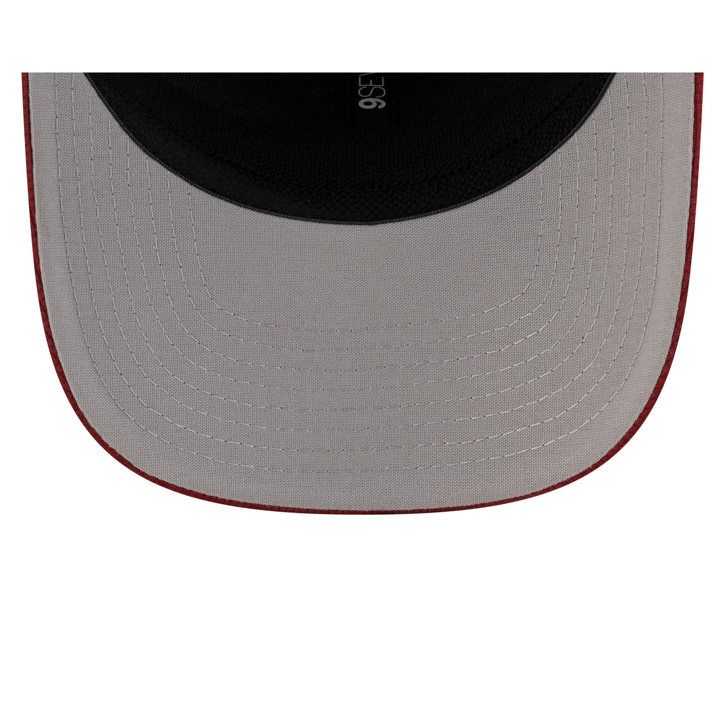 The Birmingham Stallions Red 9SEVENTY Stretch-Snap features an embroidered Stallions logo at the front panels with the New Era Flag at the left. Additional details include a UFL logo above a snapback closure at the rear and a gray undervisor.