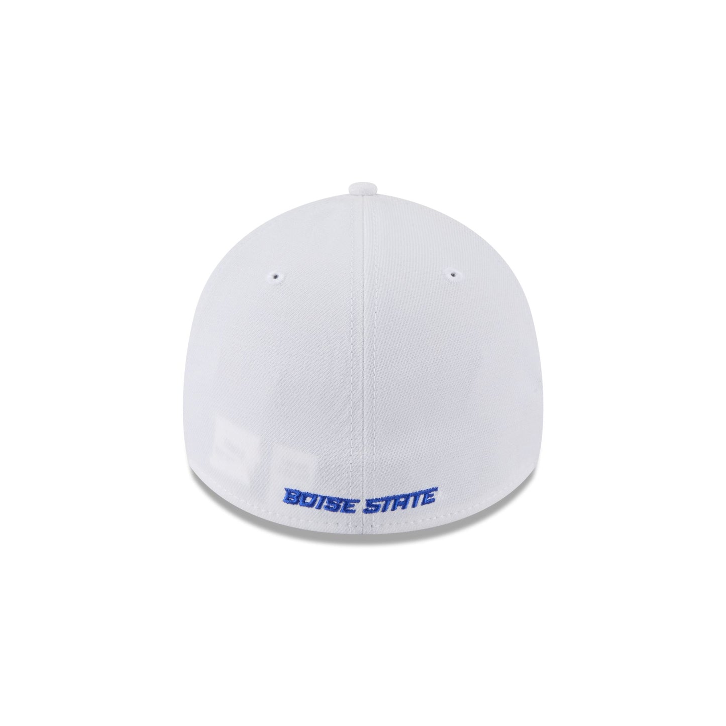 The Boise State Broncos Optic White 39THIRTY Stretch Fit features an embroidered Broncos logo at the front panels with a team wordmark at the rear.