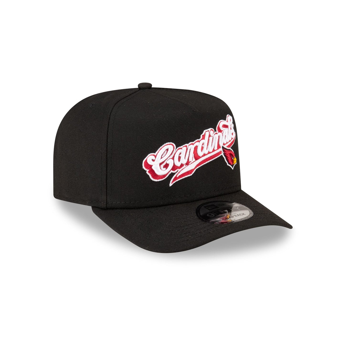 The Born x Raised x Arizona Cardinals Script Black 9FIFTY A-Frame Snapback features an embroidered Cardinals script wordmark with logo at the front panels and a Born x Raised logo above an adjustable snapback closure at the rear. Additional details include a pre-curved visor and a green undervisor.